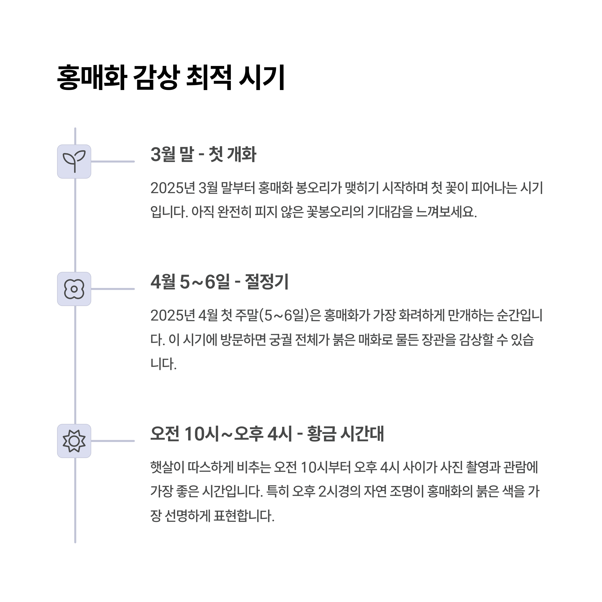 2025년의 홍매화는 3월 말에 꽃망울을 터뜨리기 시작하여 4월 초에는 완전히 만개하며 많은 사람들의 사랑을 받았습니다. 특히 4월 첫째 주말(5~6일)에 창덕궁을 찾은 이들은 가장 절정의 홍매화를 감상할 수 있었는데요, 햇살을 받으며 빛나는 홍매화의 붉은빛은 고궁의 담장과 절묘하게 어우러지며 탄성을 자아냈습니다. 사진 촬영을 원하는 분들에겐 이 시기가 가장 적기이며, 오전 시간대에는 비교적 관람객이 적어 여유롭게 즐기기에 좋습니다. 창덕궁의 여백이 주는 고요함 속에서 피어난 홍매화는 마음까지 따뜻하게 만들어줍니다.