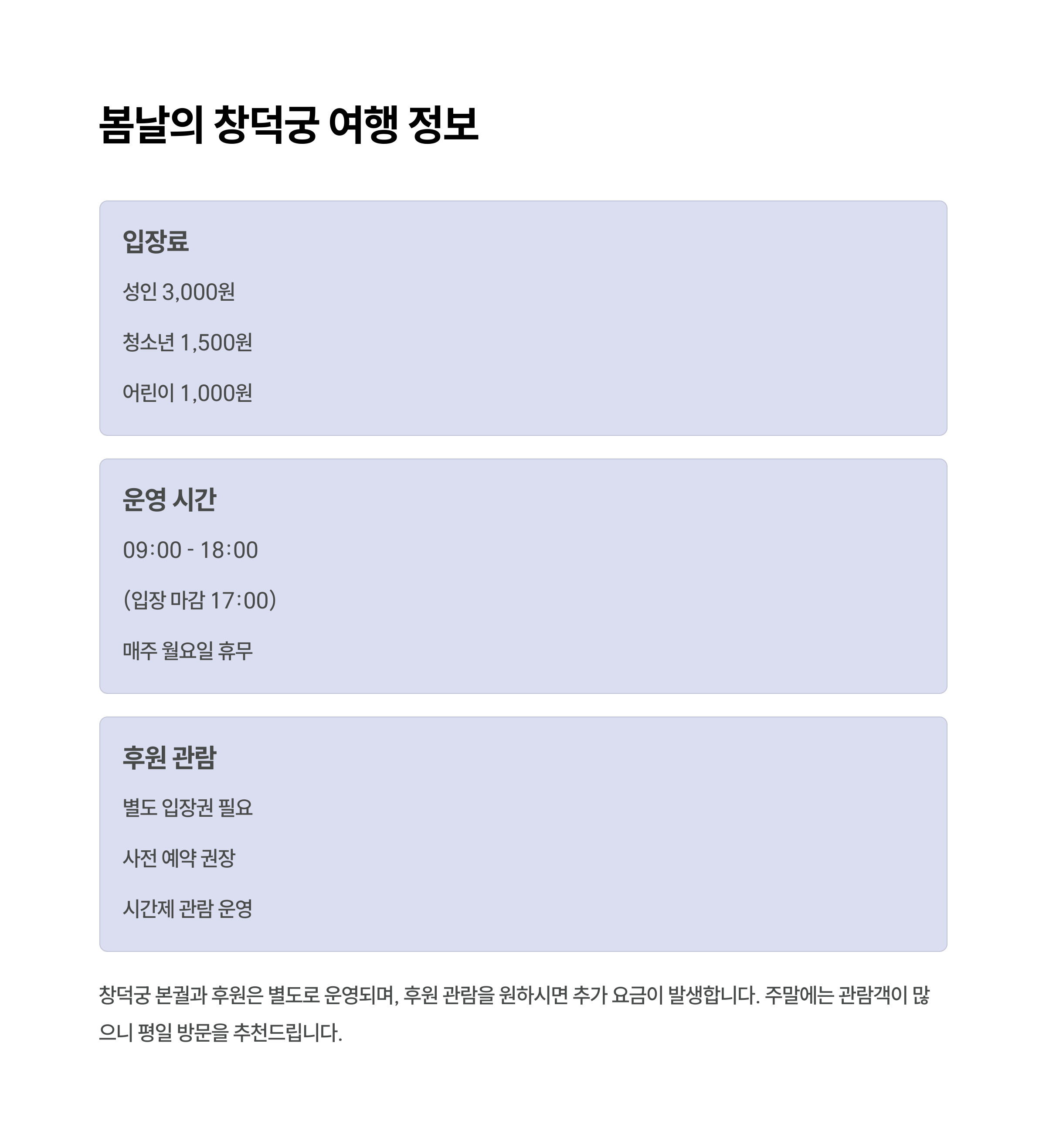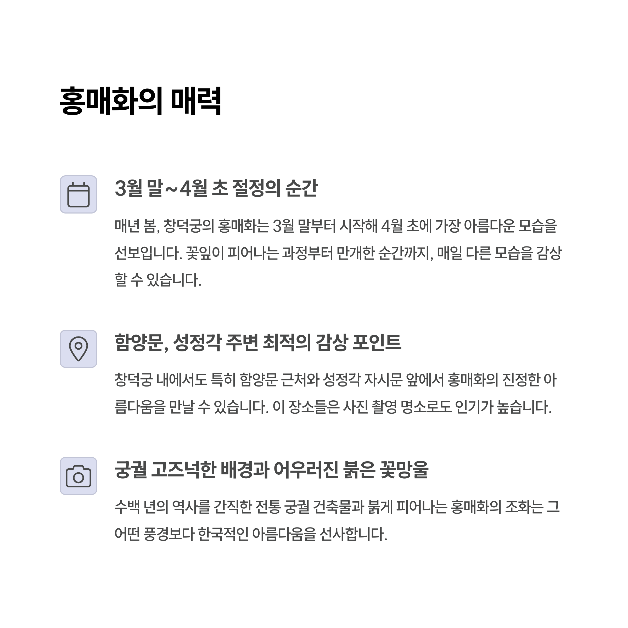 창덕궁의 홍매화는 서울 도심 속에서 만나는 가장 특별한 봄 풍경 중 하나입니다. 봄을 대표하는 꽃들과 함께 고궁의 정취를 즐길 수 있는 이곳은 도심 속 힐링을 원하는 이들에게 강력히 추천할 만한 장소입니다. 특히 가족, 연인, 친구와 함께 사진을 찍고 추억을 남기기에 더없이 좋은 환경이며, 입장료 또한 부담이 적어 누구나 쉽게 방문할 수 있습니다. 이른 아침의 맑은 공기와 조용한 분위기 속에서의 산책은 평소 바쁜 일상에 지친 분들에게 큰 위로가 될 것입니다. 올봄, 잠시 시간을 내어 창덕궁으로 향해보는 건 어떨까요? 분명 마음속 깊이 기억될 하루가 될 것입니다.