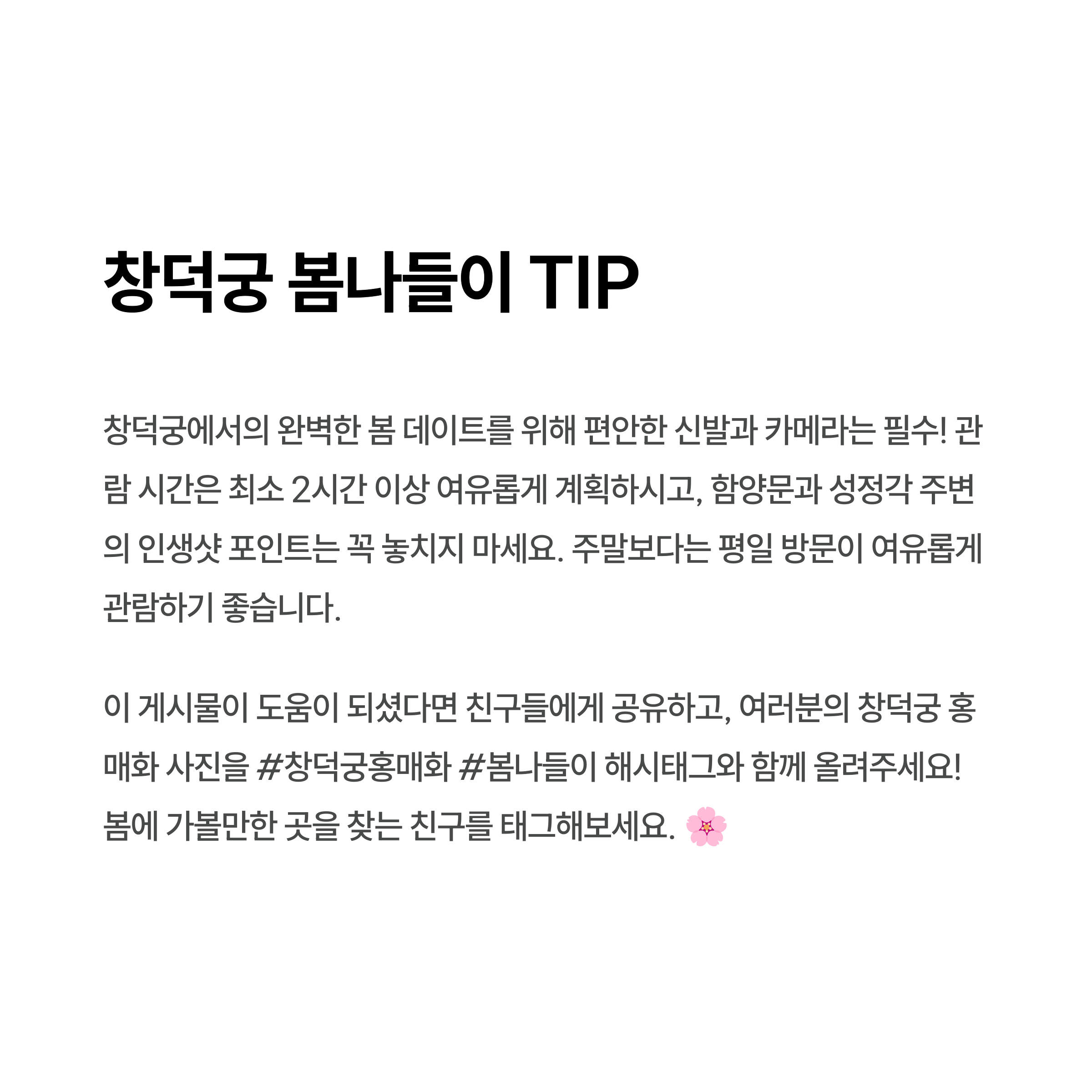 창덕궁의 홍매화를 보신 적 있으신가요? 혹은 궁금한 점이 있으신가요? 아래 댓글로 여러분의 경험과 질문을 자유롭게 남겨주세요! 서로의 정보를 공유하며 더 풍성한 봄나들이 계획을 세워보아요.
