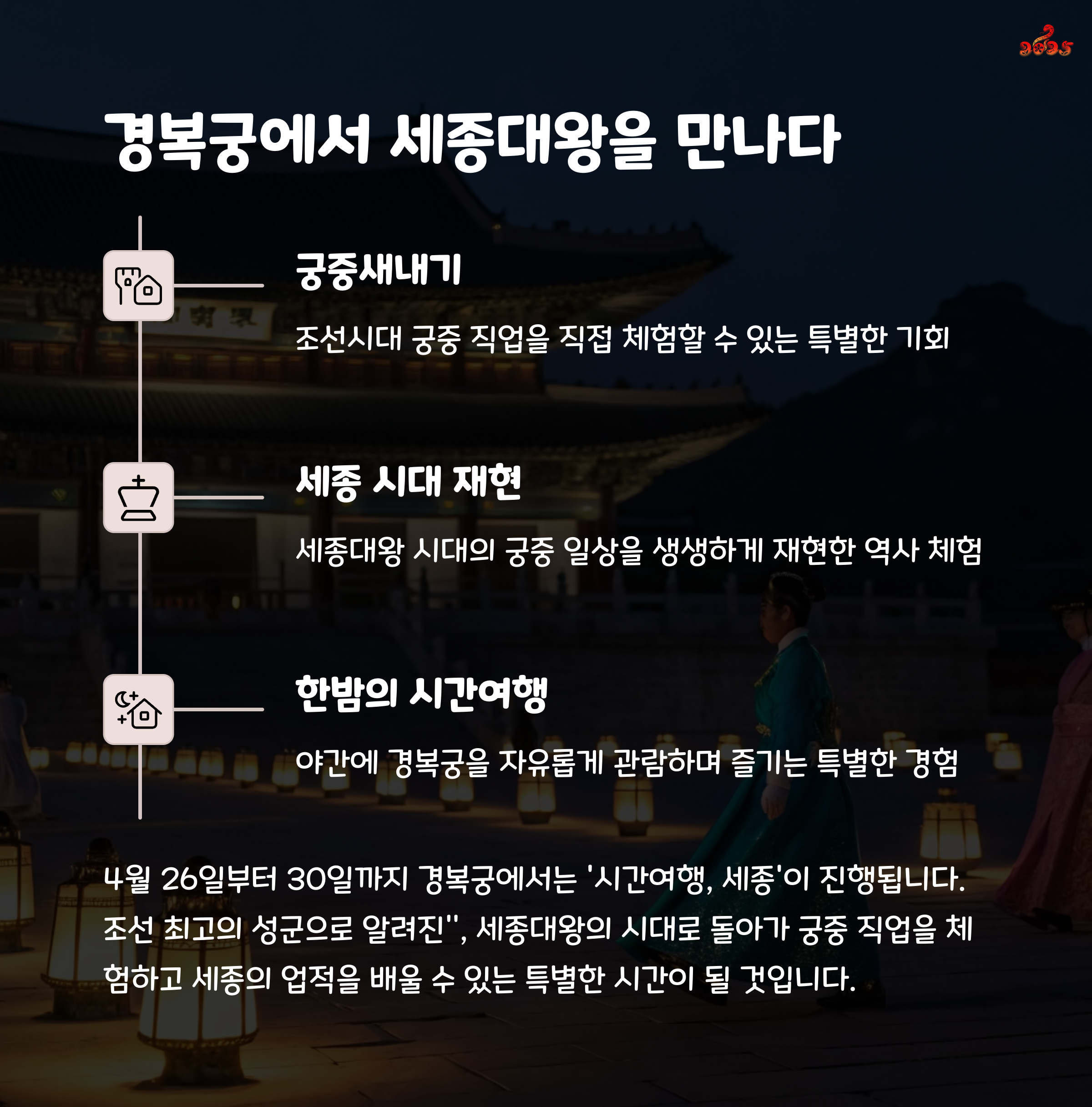 | 시간여행, 세종 | 세종대왕의 생애 재현 | 경복궁 | 사전 예약 필수 |