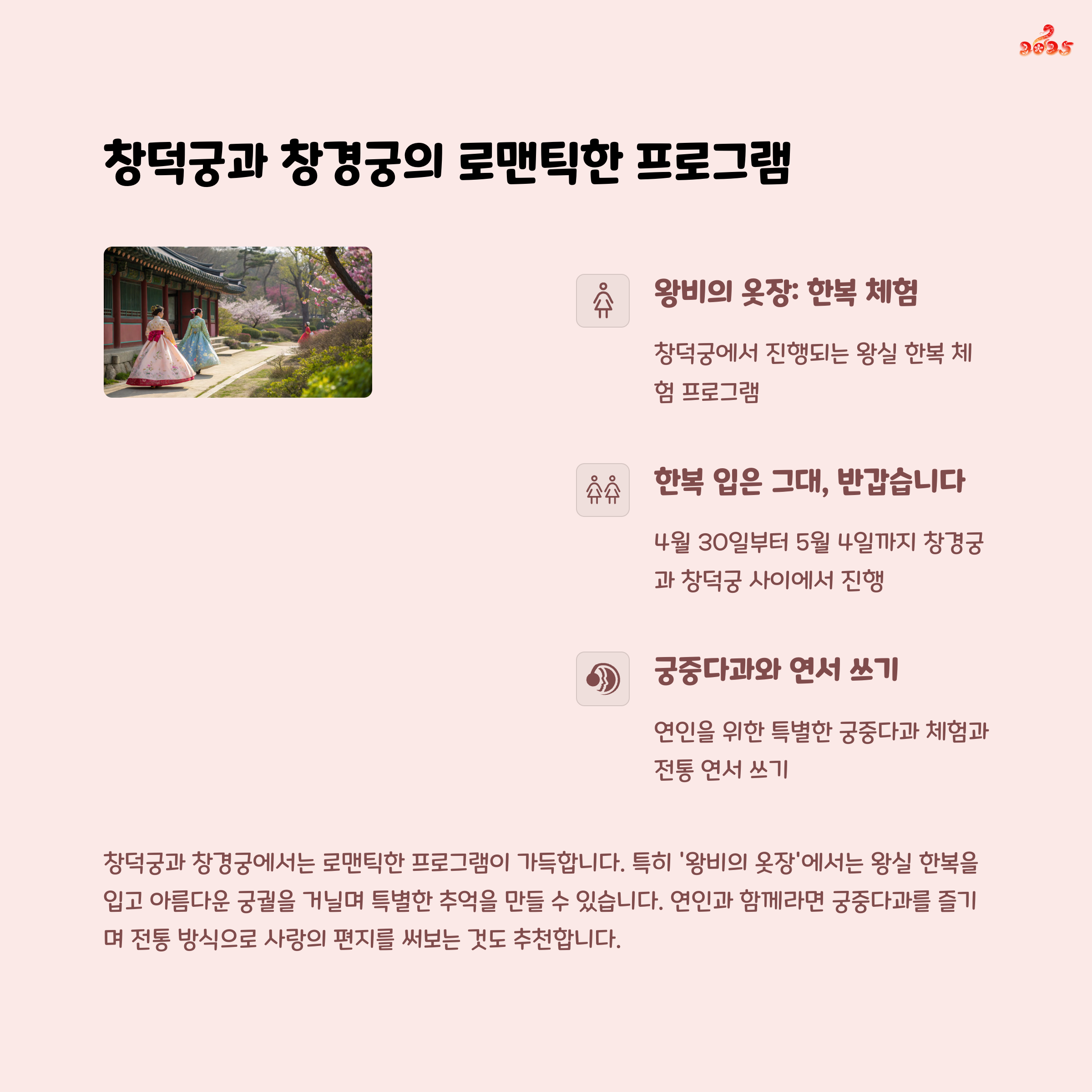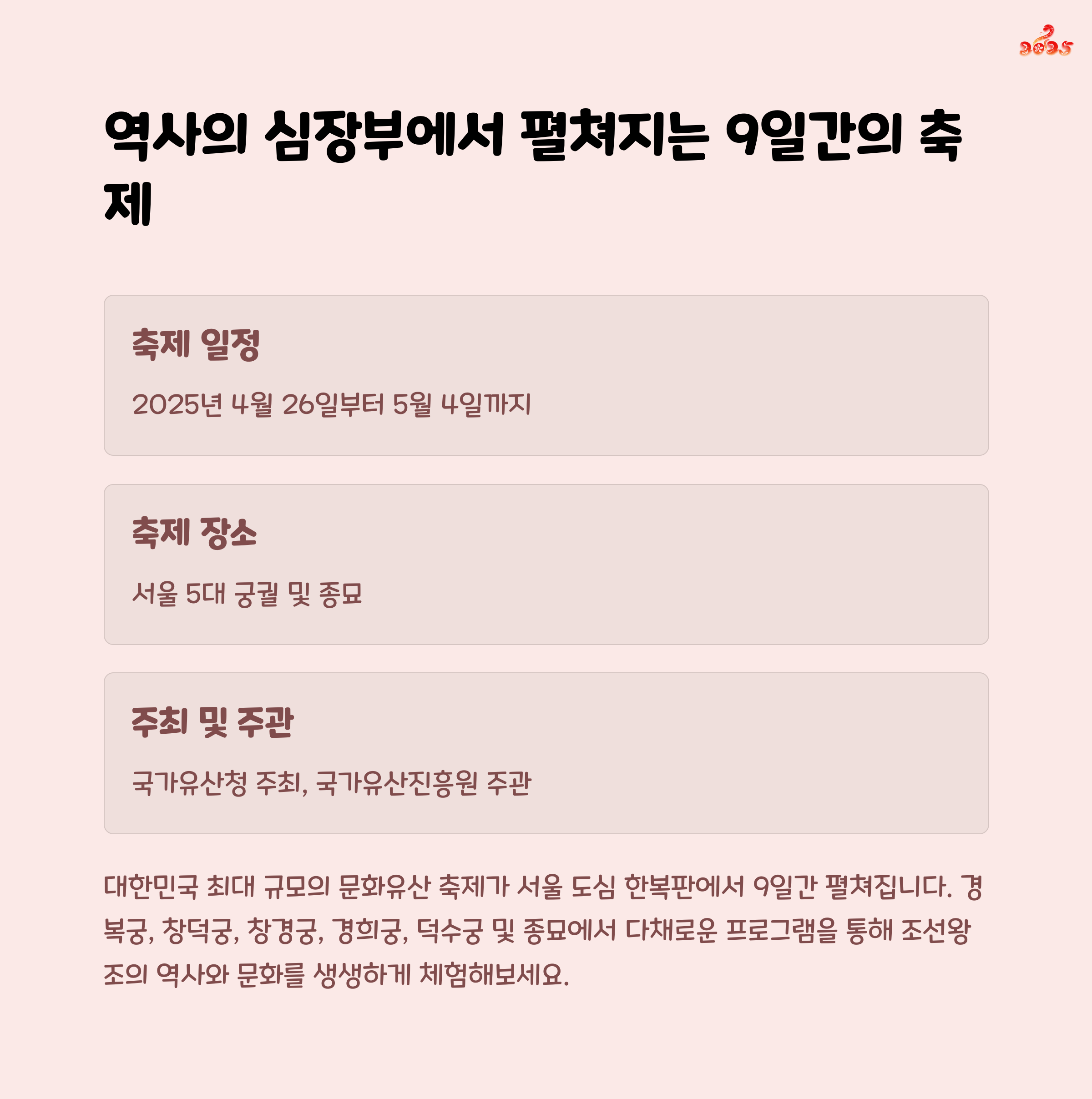 2025 봄 궁중문화축전은 조선왕조의 궁궐을 배경으로 열리는 특별한 전통문화 축제입니다.