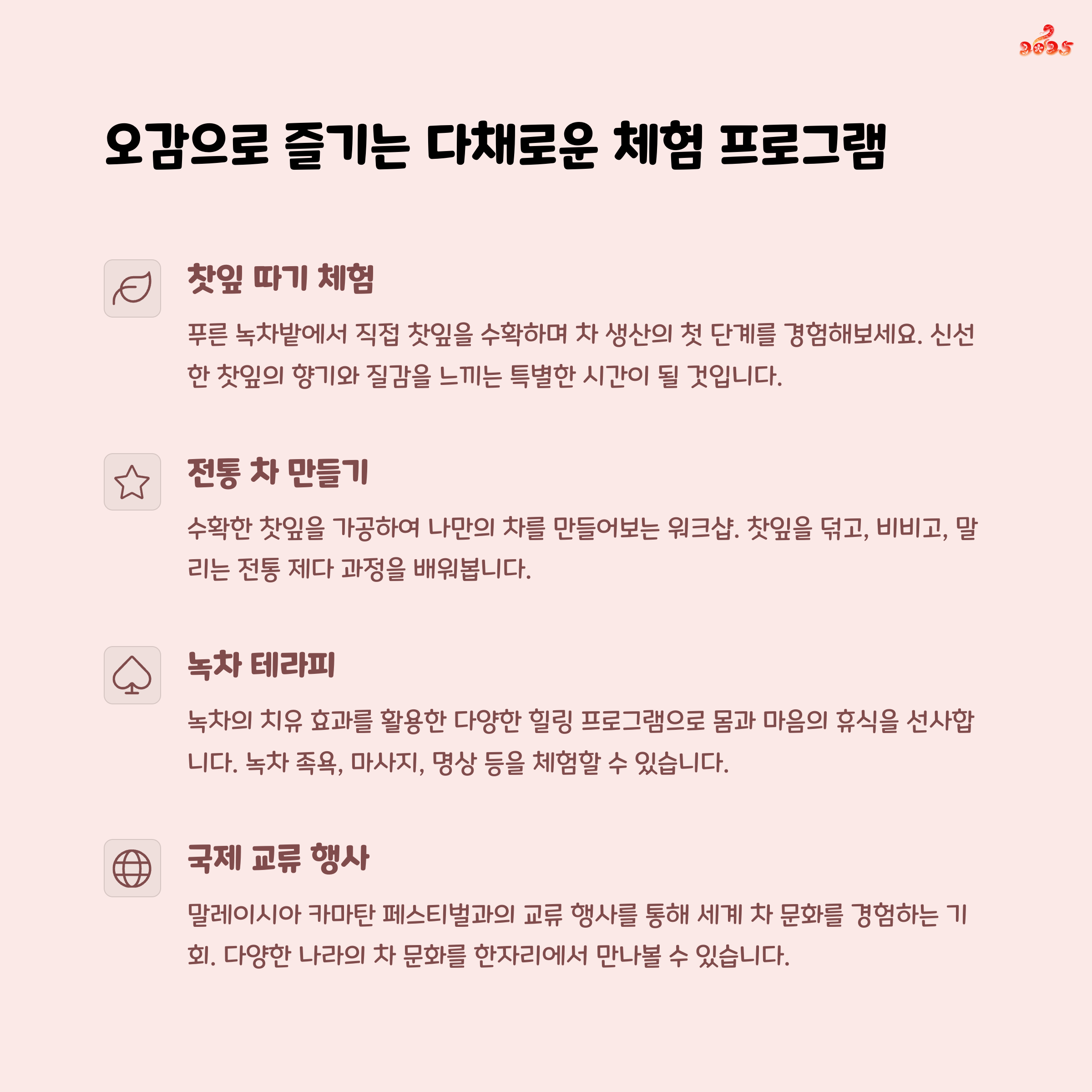 전통 찻잎 체험 프로그램과 건강 중심의 녹차 테라피는 축제의 대표 장점입니다.