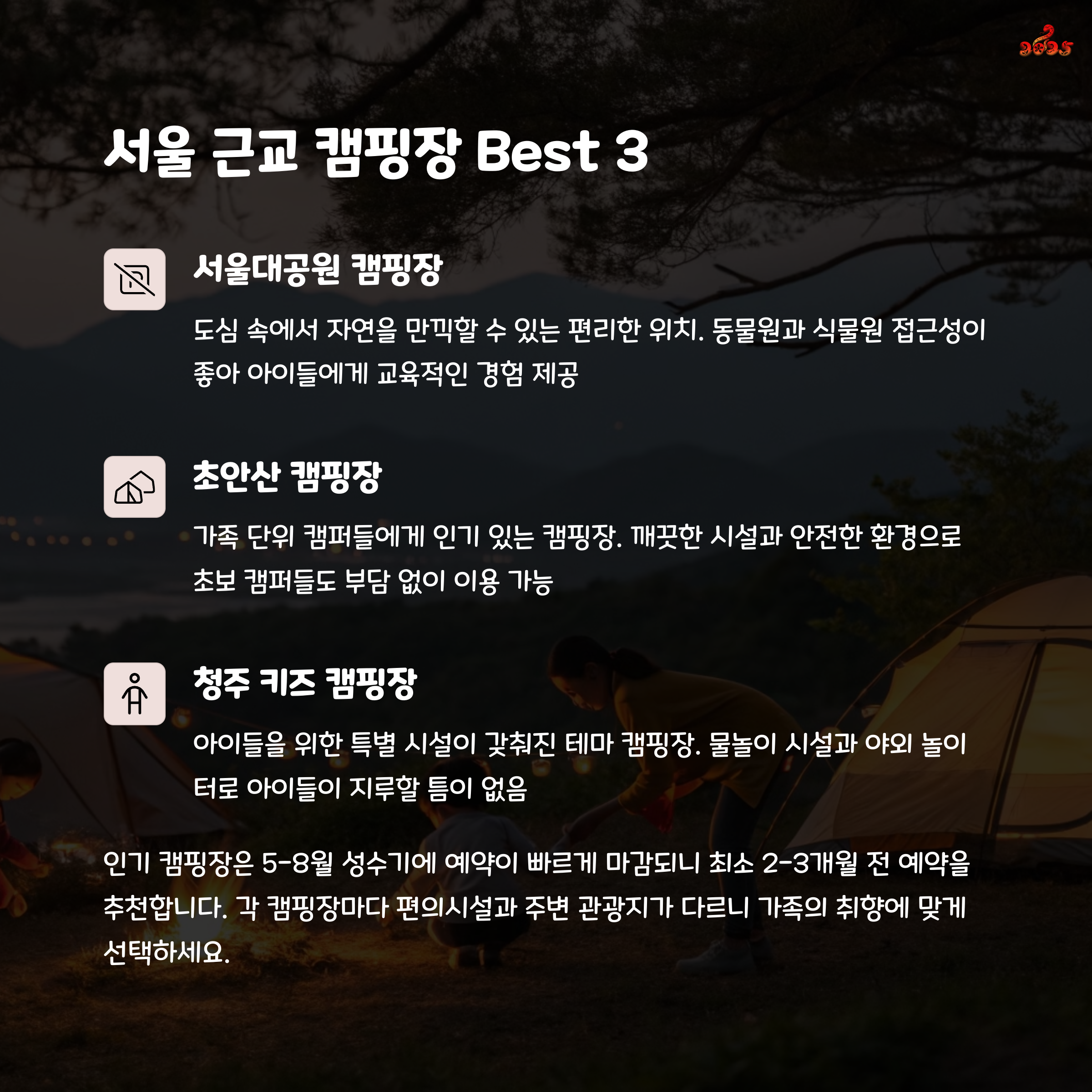 주변 지역의 숙소와 캠핑장은 사전 예약 필수입니다.