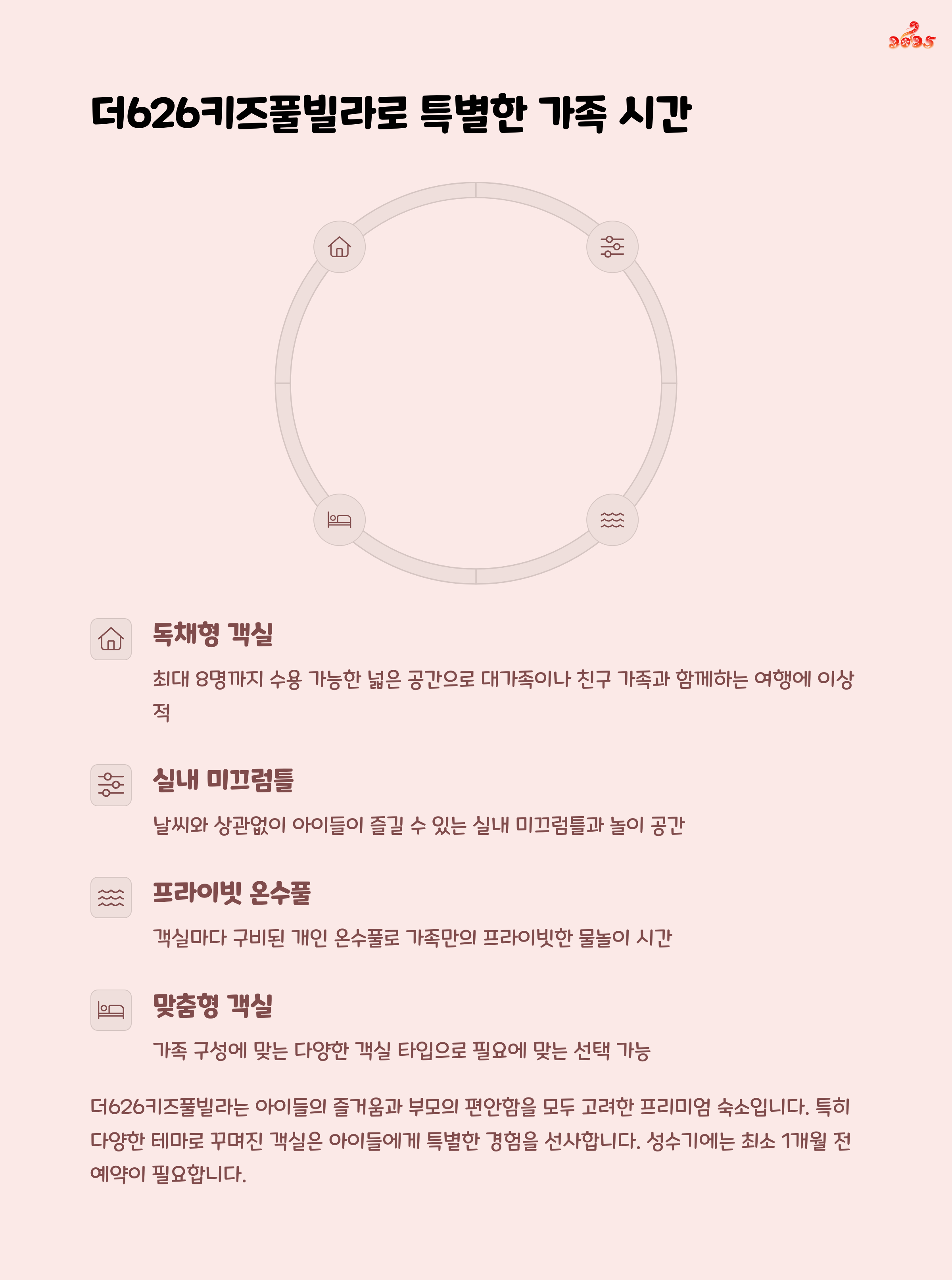 | 키즈 숙소 선택 시 안전성과 편의시설이 가장 중요합니다. 미끄럼틀, 프라이빗 수영장 등 아이들이 즐길 수 있는 시설이 있는지 확인하세요. 경주 팰리스한옥풀빌라와 같이 실내 놀이터와 온수풀이 있는 숙소를 추천합니다. 부모님은 <strong차분한 힐링 공간>을 통해 휴식을 취할 수 있고 아이들은 활동성을 유지할 수 있도록 양쪽 요소를 균형 있게 제공하는 숙소가 좋습니다. |