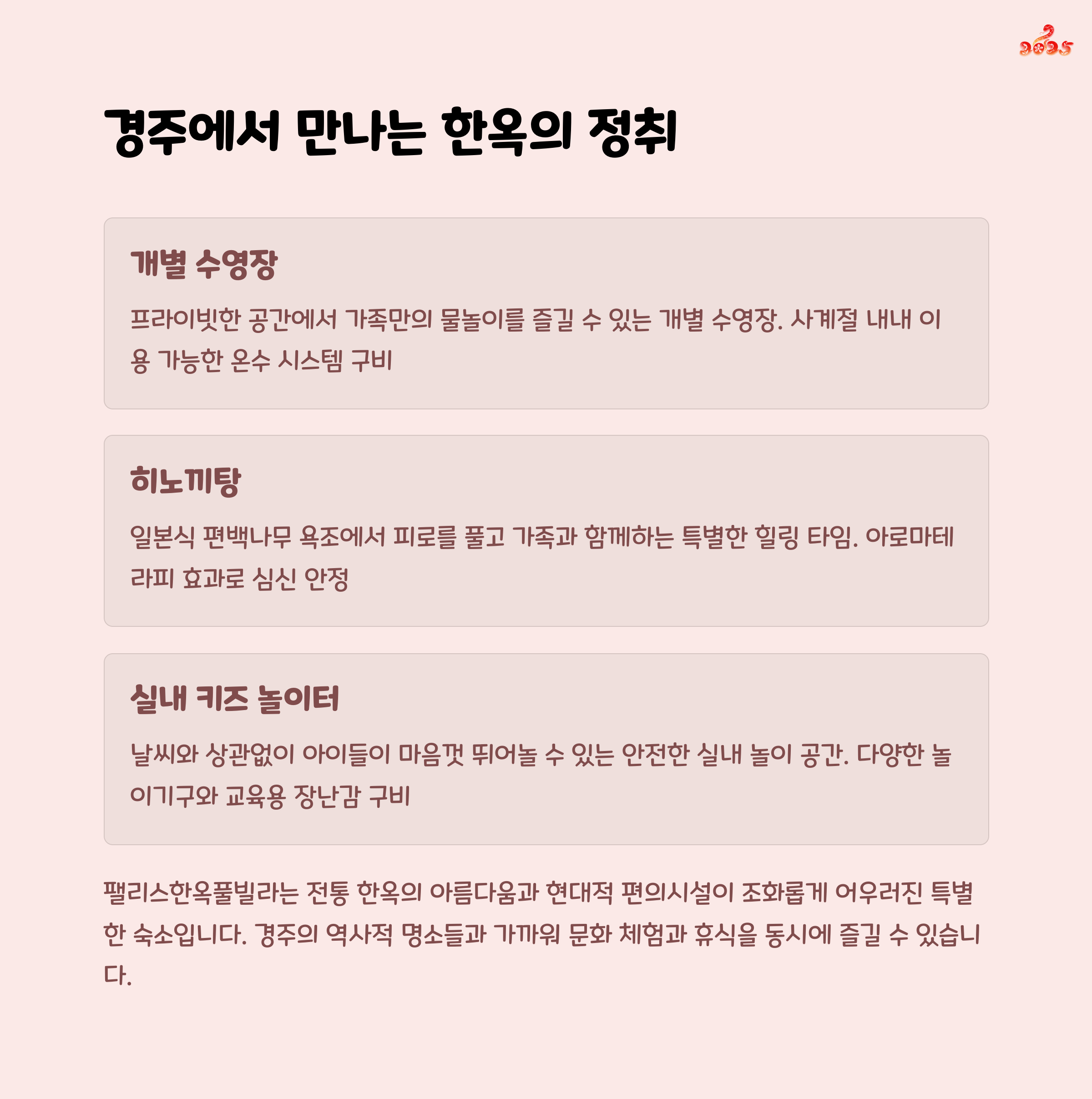 | 경주 팰리스한옥풀빌라 주요 시설 | 개별 수영장, 히노끼탕 |