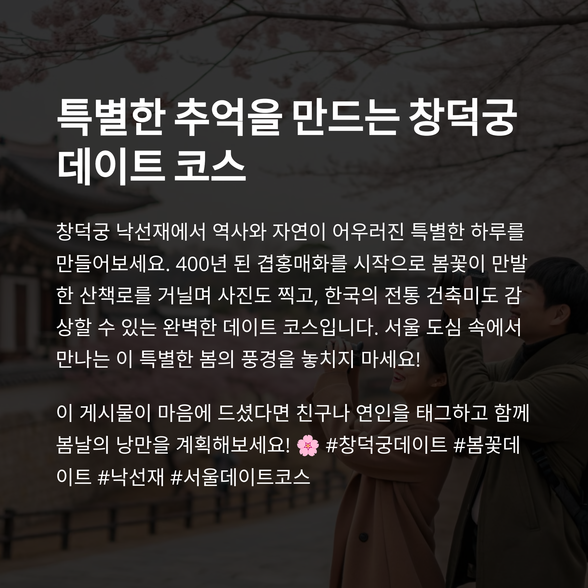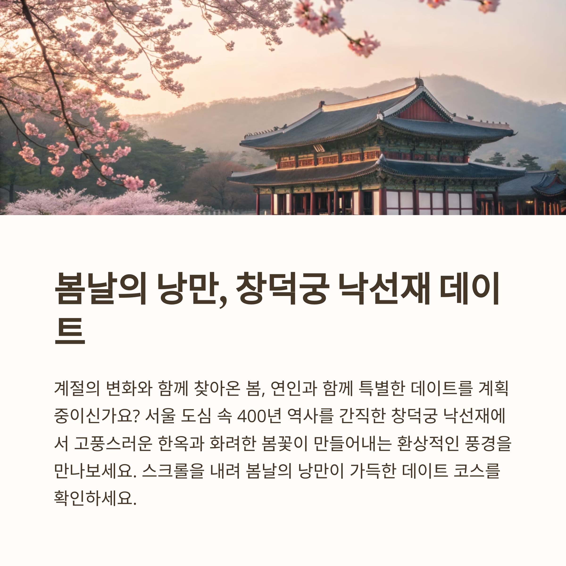 여러분은 창덕궁 낙선재에서 어떤 봄을 느끼셨나요? 기억에 남는 데이트 추억이 있다면 댓글로 공유해주세요. 더 많은 분들과 함께 공감하고 싶습니다!