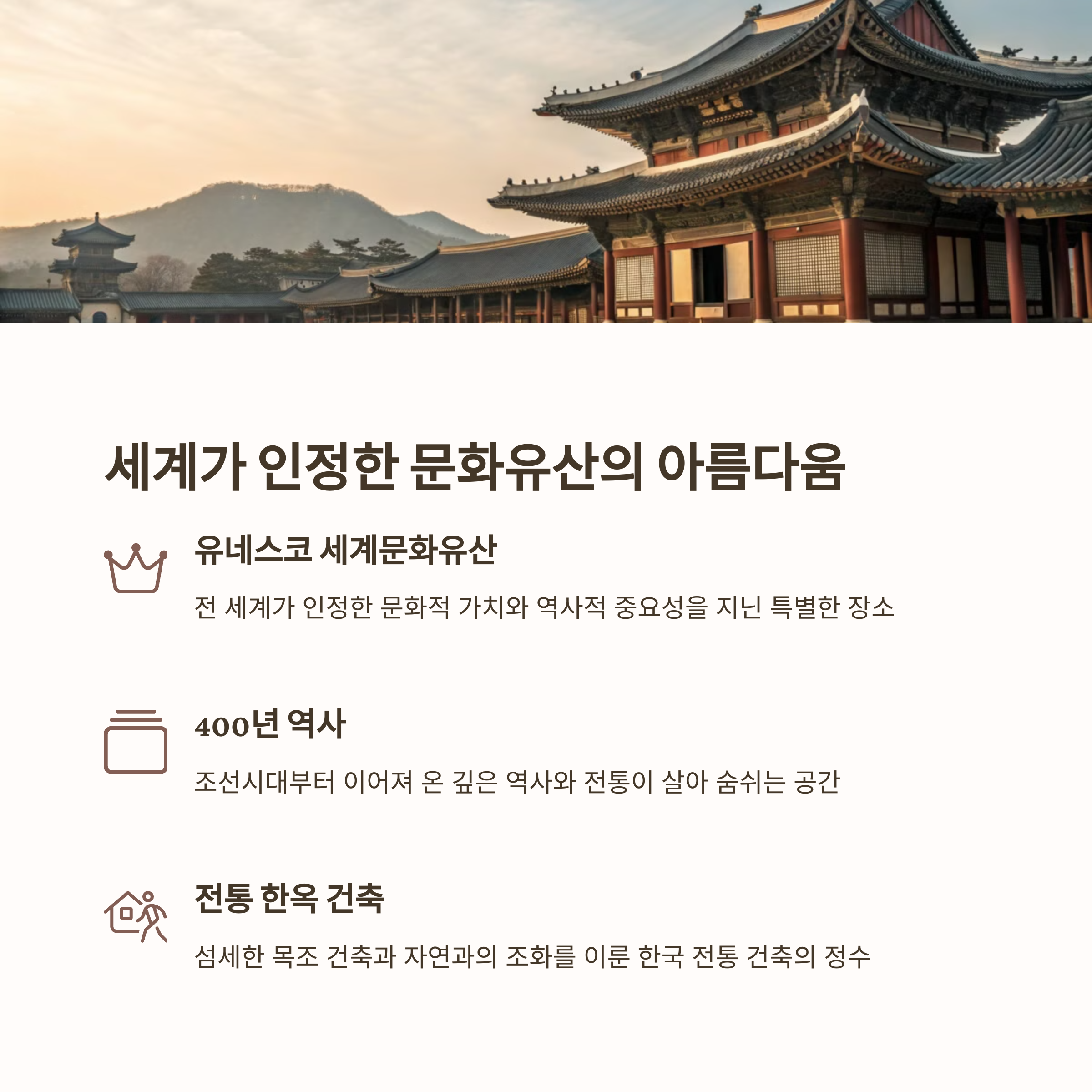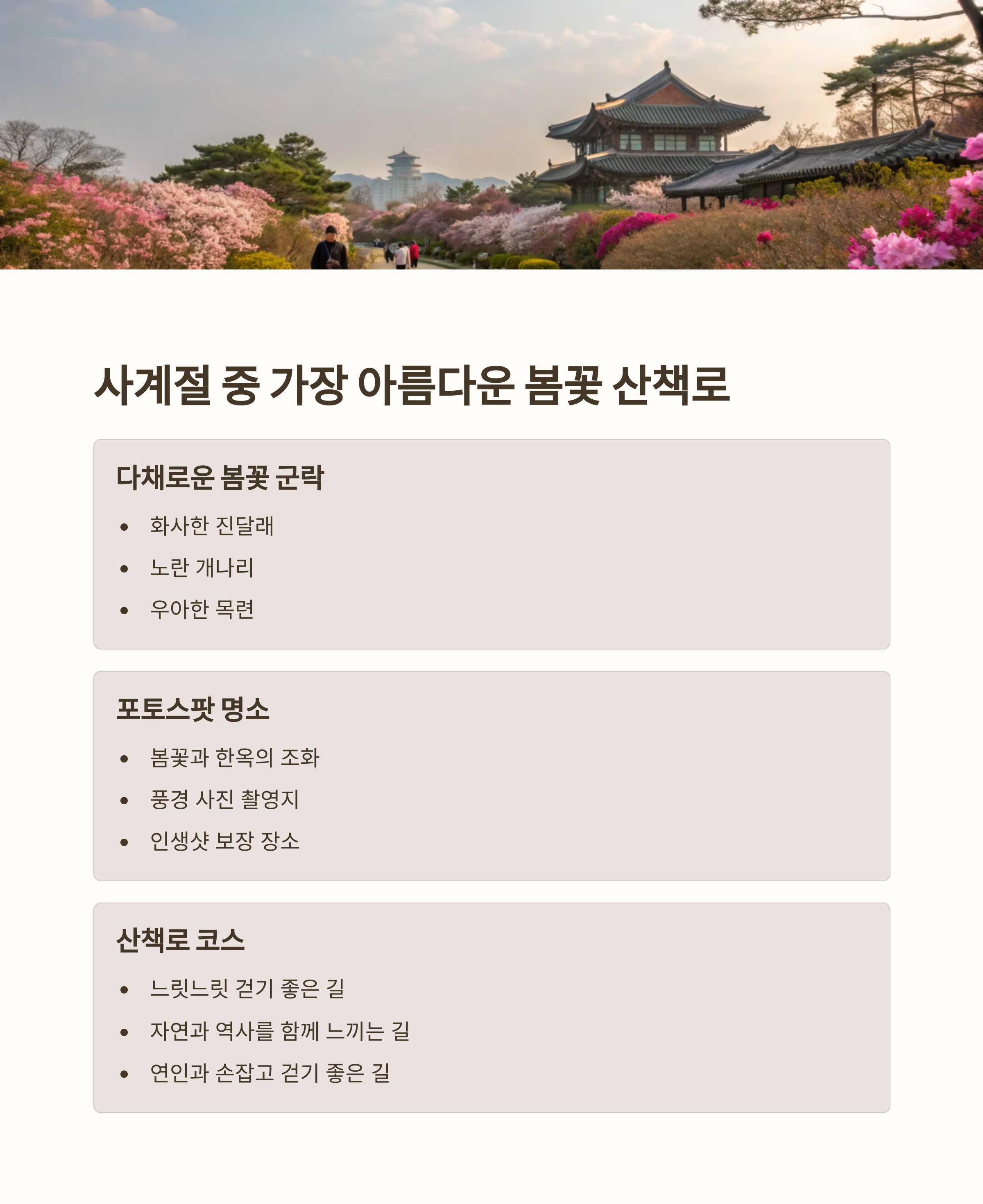 | 한옥과 봄꽃의 아름다운 조화 | 사진 찍기 좋은 계절과 장소 | 사전 시간 확인 후 일정 조율 필요 |
