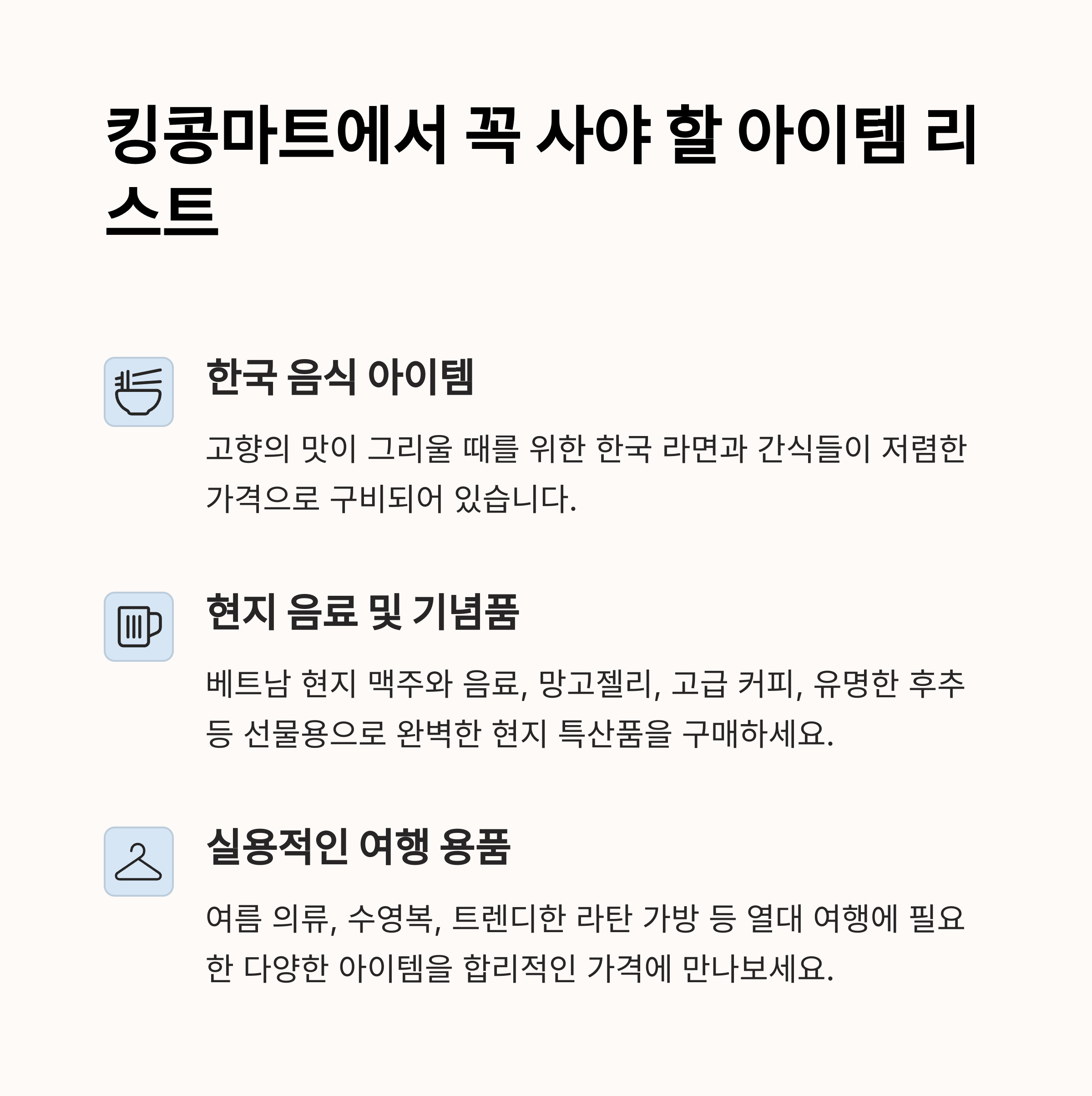 | 킹콩마트에서 인기 있는 품목은 지역 특산품과 선물용 간식입니다. 망고젤리와 커피는 푸꾸옥 여행객들이 가장 많이 구매하는 품목 중 하나입니다. 라탄 가방과 자개 장식품 같은 수공예 기념품도 매우 인기 있습니다. 현지 맥주와 과자류는 저렴하면서도 맛이 좋아 추천됩니다. 선크림과 실내용품도 실용적인 구매 리스트에 포함됩니다. |