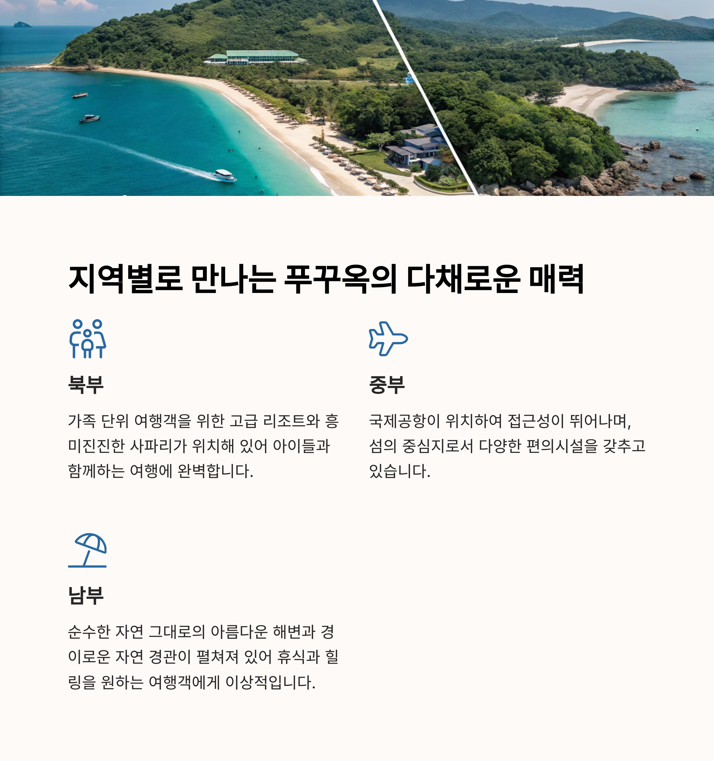 특히 푸꾸옥은 북부, 중부, 남부로 나뉘어 지역별 특징을 파악하면 효율적인 여행이 가능합니다.