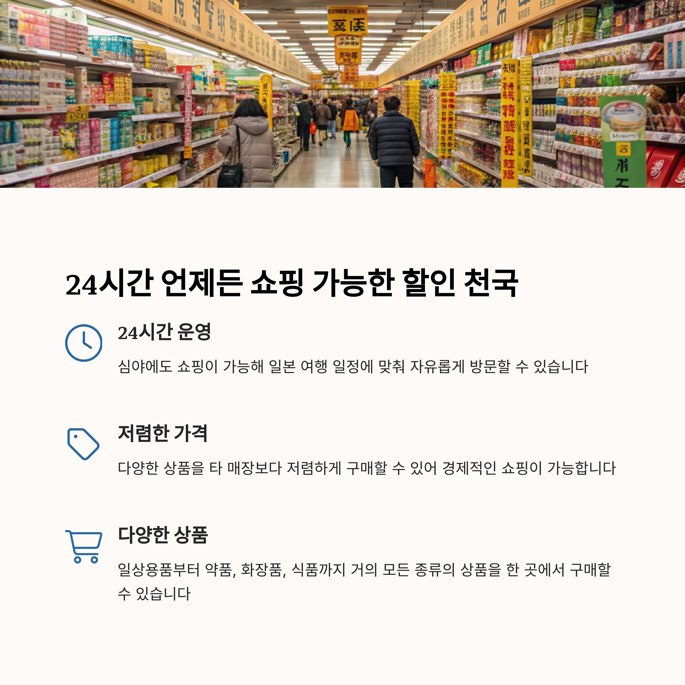 일본 여행 중 쇼핑할 시간이 부족하다면 24시간 운영 매장을 활용하세요.