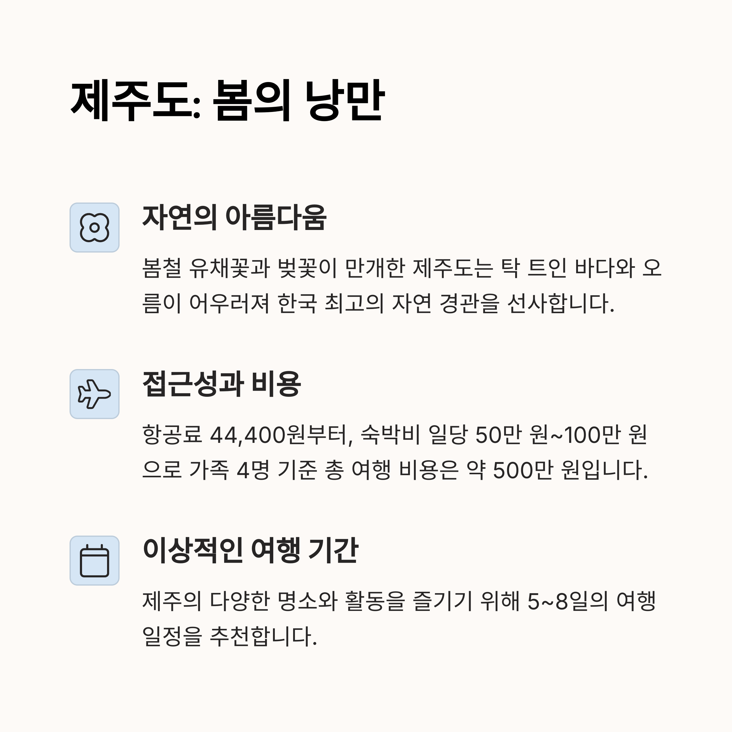 제주는 비용과 교통 측면에서 큰 장점을 가지며, 가족과 자연을 즐기기 위한 국내 최고의 여행지입니다.