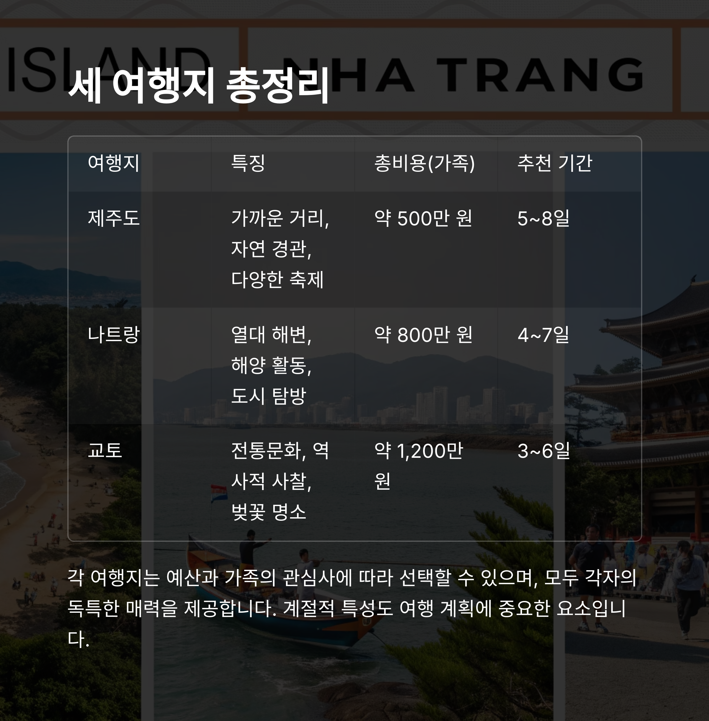 | 제주는 세 가지 여행지 중 가장 경제적인 선택입니다. 항공료가 가장 저렴하며, 항공료는 성인 기준 약 44,400원입니다. 숙박 및 음식 비용 또한 국내 여행이라는 점에서 상대적으로 낮은 편입니다. 나트랑은 국제 항공료와 리조트 비용이 포함되어 제주보다 비용이 높습니다. 교토는 항공료와 숙박 비용 모두 가장 높아 전체적으로 가장 비용 부담이 큰 장소입니다. |
