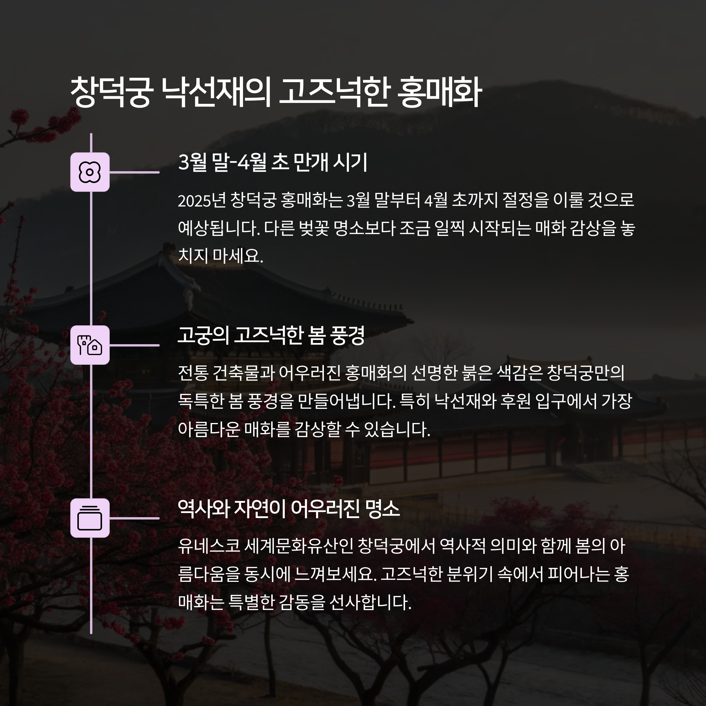 | 낙선재 홍매화 개화 시기 | 3월 말~4월 초 개화, 현재 만개 상태로 관람 적기 |