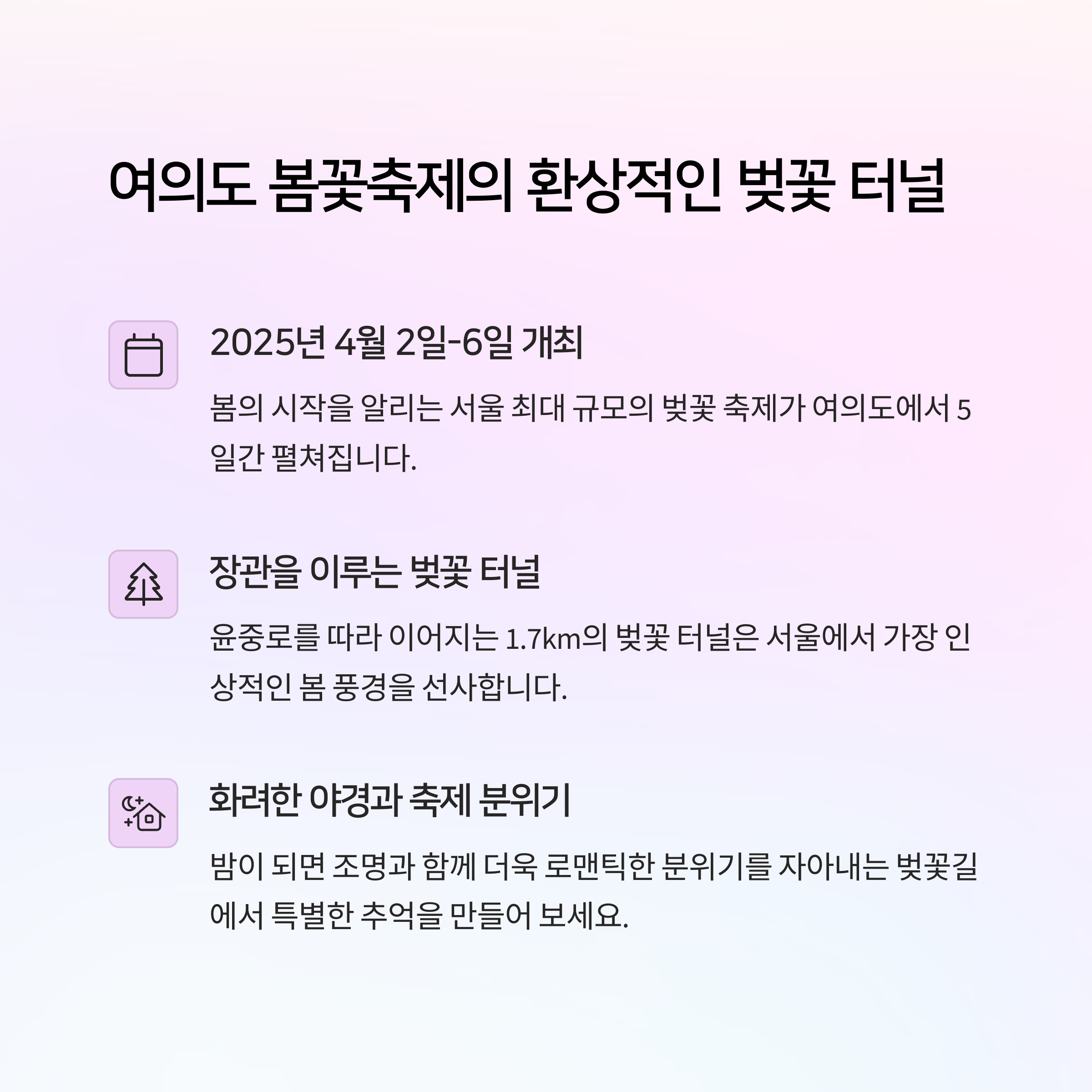 | 2025년 여의도 봄꽃축제 | 4월 2일부터 6일까지 벚꽃터널 중심으로 진행 |