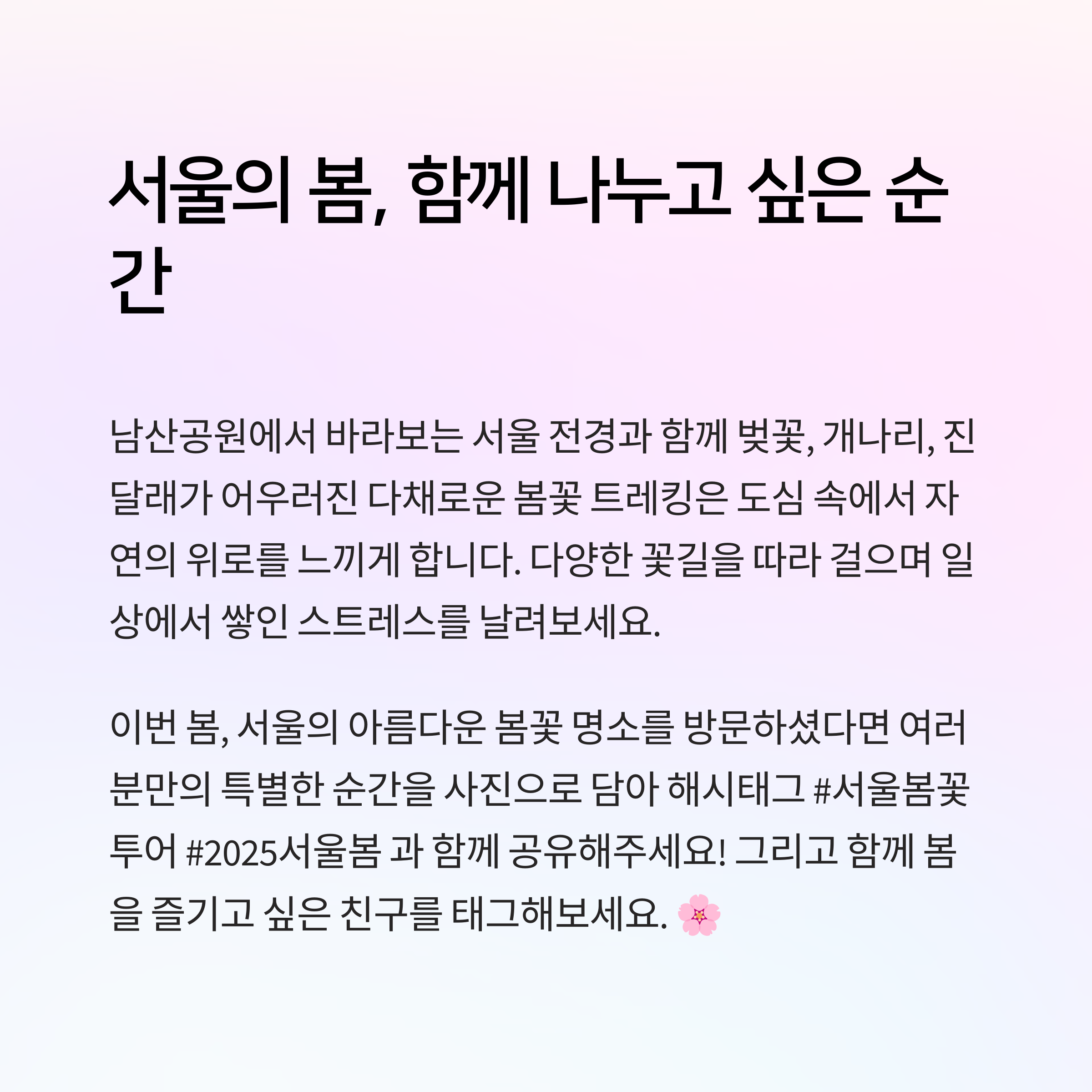 어떤 봄꽃 명소가 가장 인상 깊었나요? 혹시 추천하고 싶은 장소가 있다면 댓글로 공유해주세요! 여러분의 이야기가 또 다른 여행자들에게 큰 도움이 될 수 있습니다.