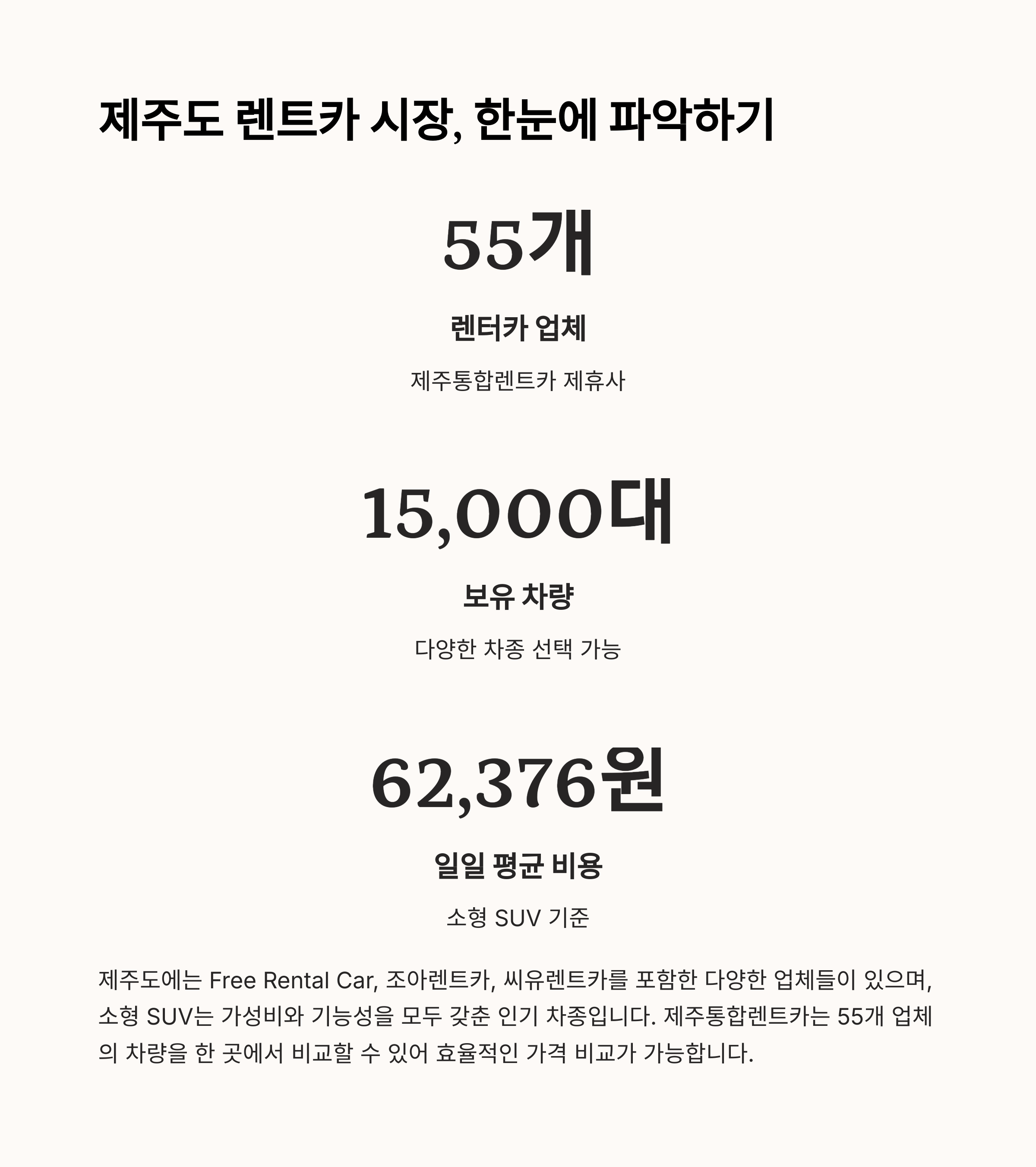 | 소형 SUV는 렌트카 업체에서 유지 관리 비용이 적기 때문입니다. 경제적인 연료 소비와 편리한 주행 성능 덕분에 인기가 많습니다. 렌트카 평균 비용을 약 ₩62,376로 낮추는데 기여하는 주요 차종입니다. 많은 여행자가 크기와 비용 사이의 균형을 원해 소형 SUV를 선택합니다. 따라서, 수요가 많아져 업체들이 경쟁적으로 가격을 낮추는 경향이 있습니다. |