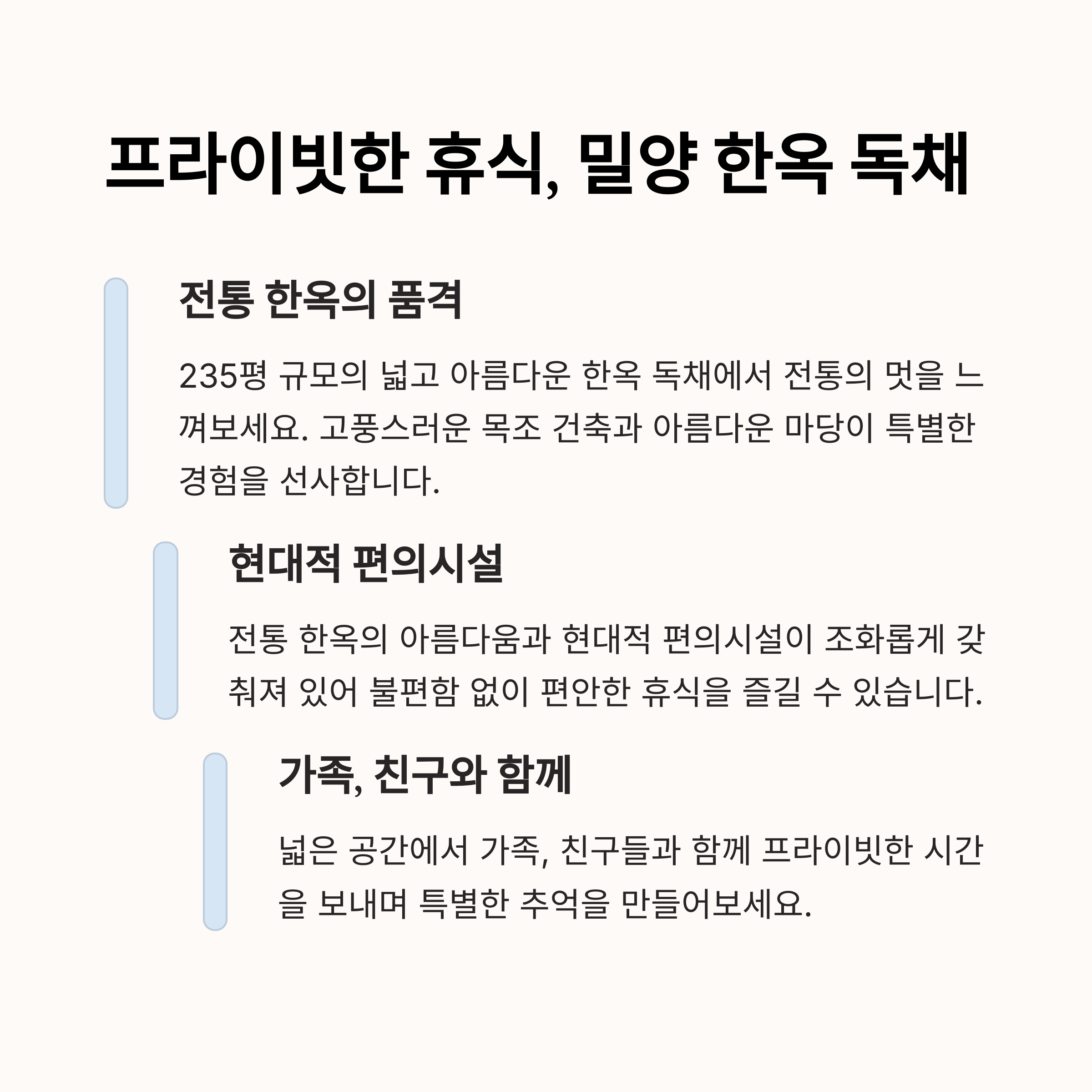 뿐만 아니라 밀양의 한옥 독채 숙소는 전통적인 미와 편안함을 동시에 제공합니다. 여행을 마무리하며 힐링의 시간을 가질 수 있죠.