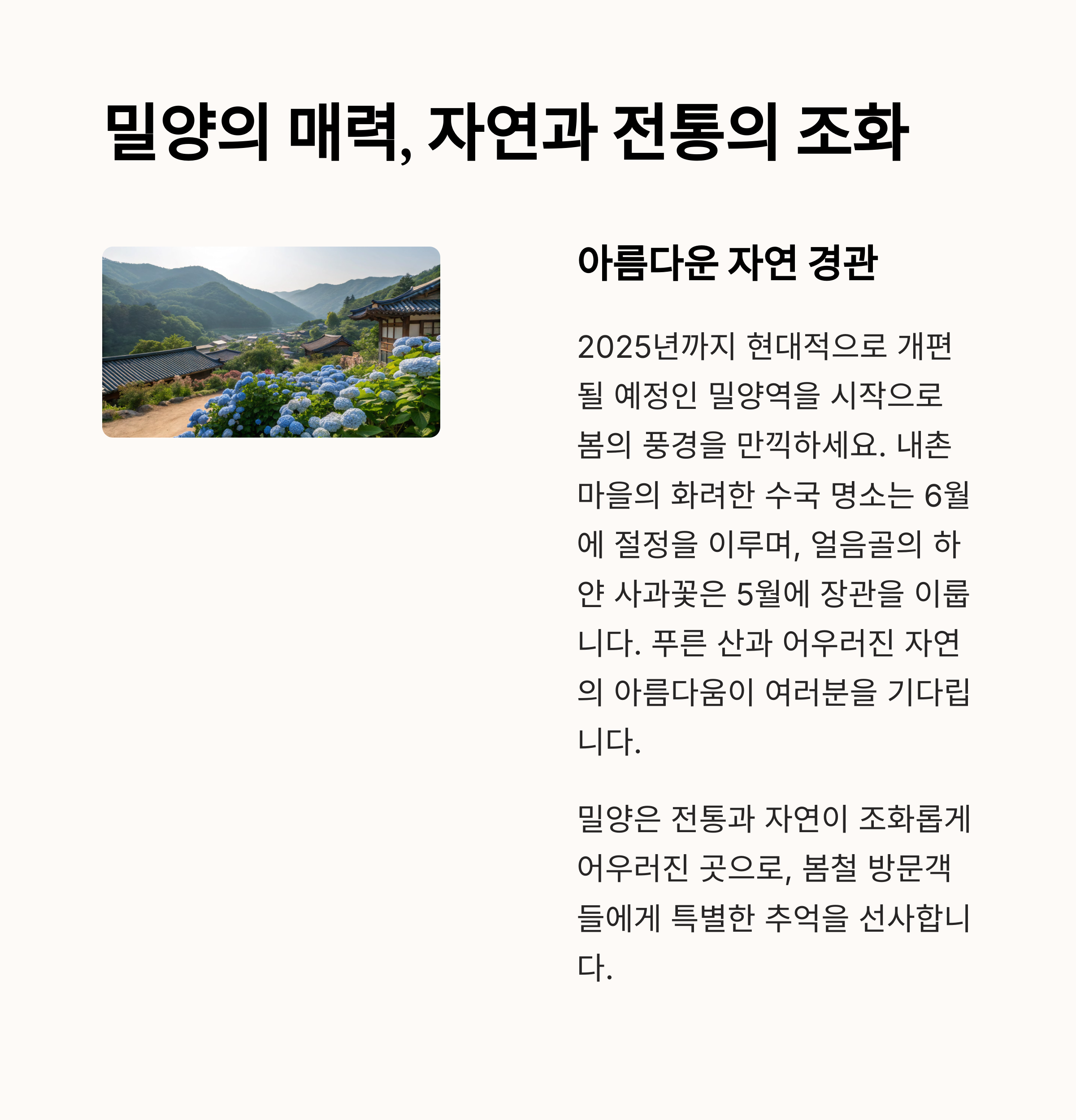 밀양역으로 이동한 후에는 '내촌마을 수국'과 밀양강 주변의 매화 명소를 꼭 방문해 보세요. 도착한 순간 봄꽃의 향기와 아름다운 풍경이 피로를 잊게 만들어줍니다.