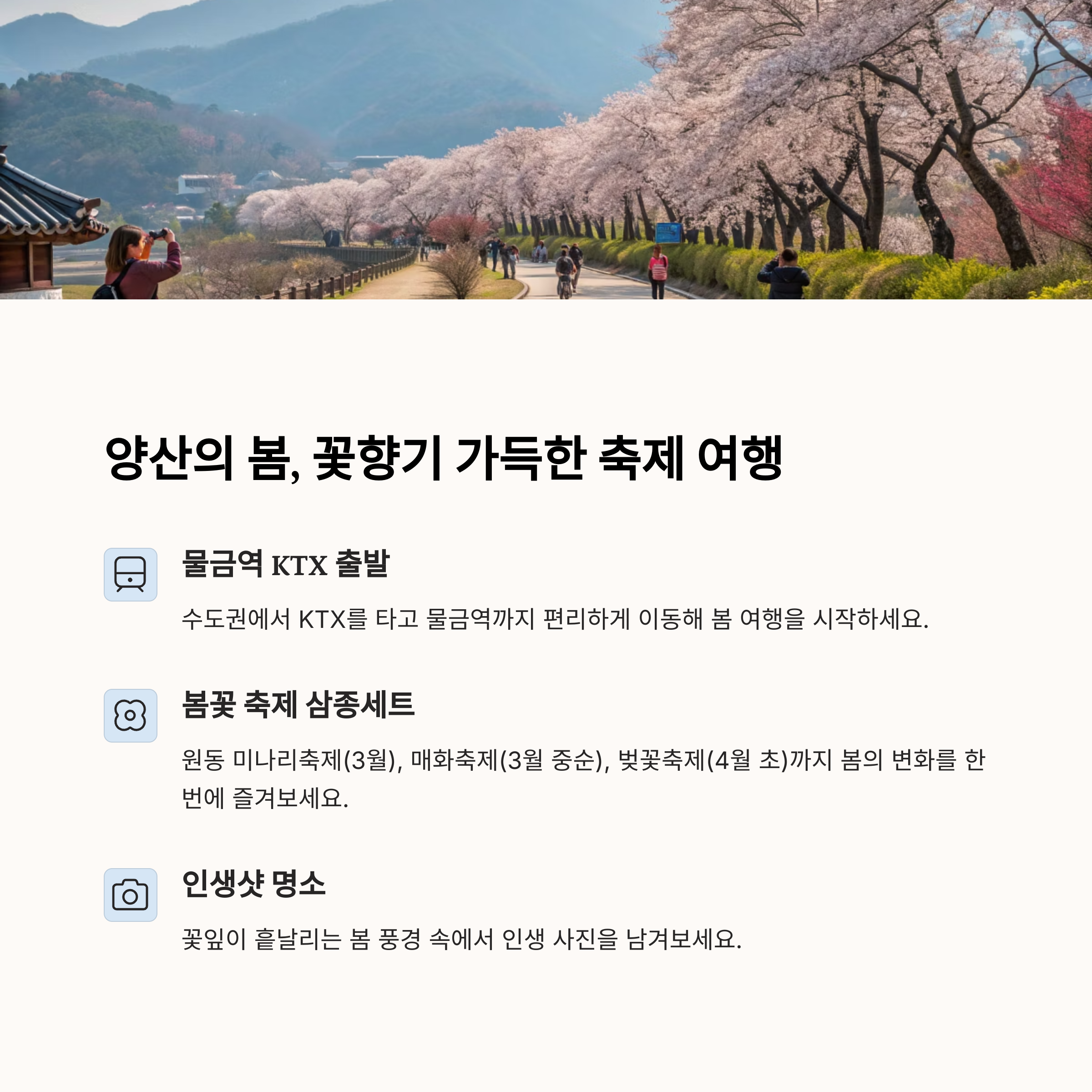 양산과 밀양을 잇는 봄철 나들이 코스를 중심으로, 즐길 거리, 볼거리 및 스마트한 이동 팁을 준비했어요.