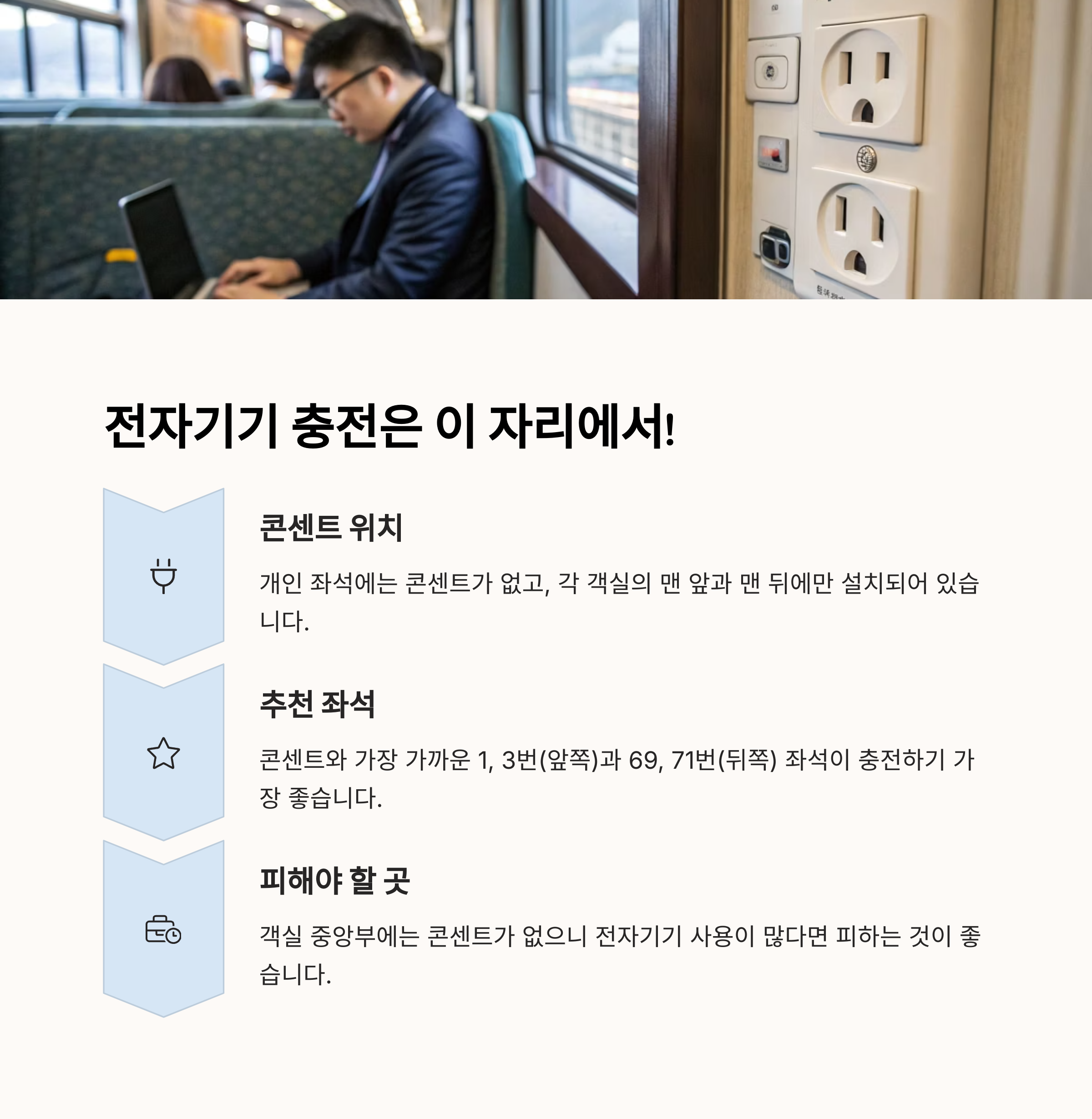 | 무궁화호의 대부분 열차는 객실 맨 앞과 맨 뒤에 콘센트가 설치되어 있습니다. 1번 좌석과 69번 좌석 같은 양 끝 좌석을 선택하면 콘센트 사용 가능성이 높습니다. 좌석 배치 확인을 통해 예매 전 콘센트 위치를 사전에 파악하는 것이 중요합니다. 특정 호차의 콘센트 설치 여부는 제한적이므로, 코레일 고객센터를 통해 확인하는 것도 방법입니다. 장시간 여행일수록 충전 기반 좌석 선택이 필수적입니다. |