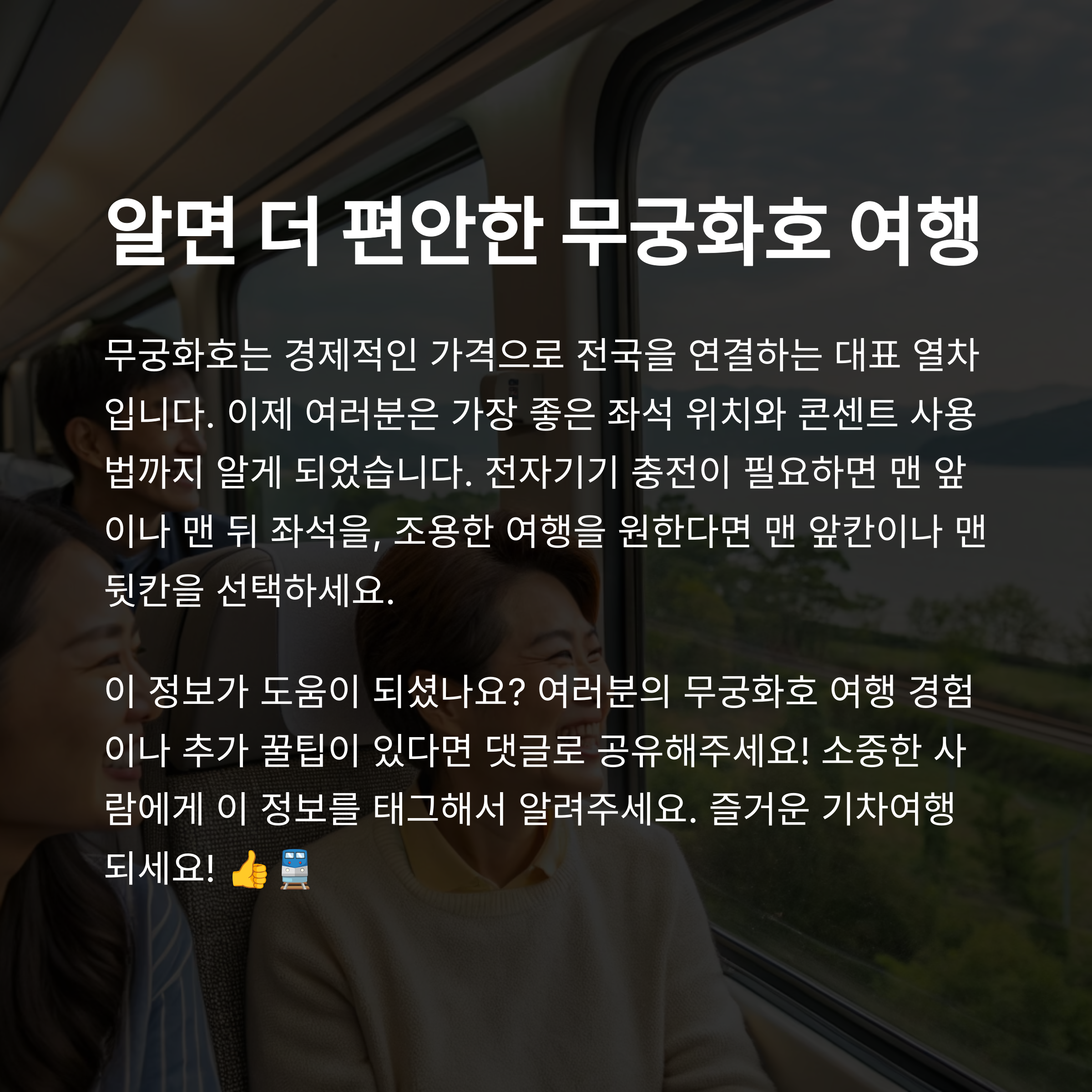 사전 계획을 통해 무궁화호의 모든 장점을 누릴 수 있으며, 여행을 더 쾌적하게 만들 수 있습니다.