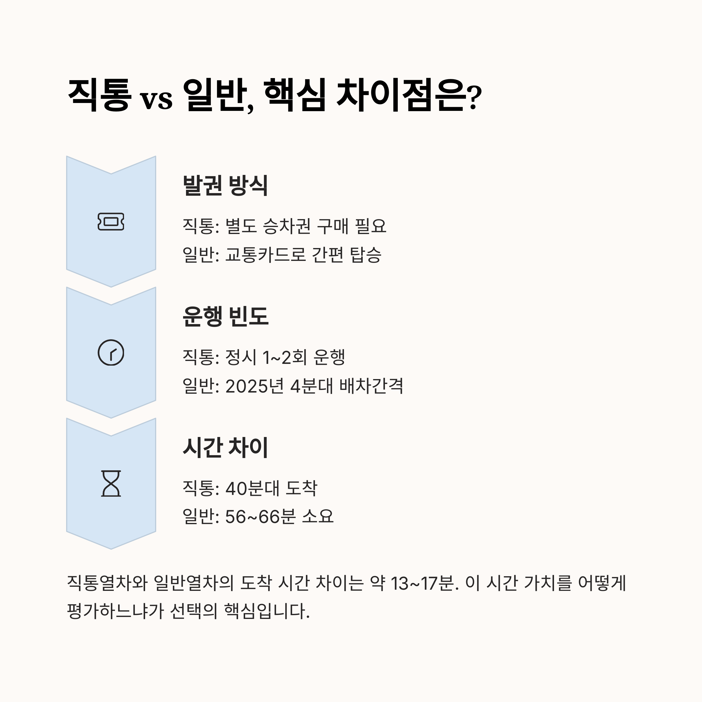 시간 절약과 편의성이 필요하다면 직통열차를, 경제성을 우선시한다면 일반열차를 선택하는 것이 좋습니다.