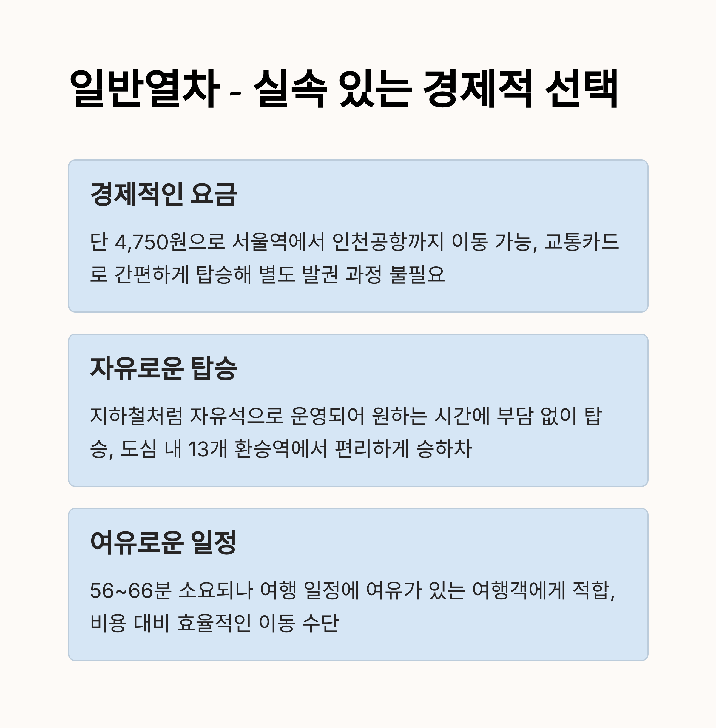 공항철도 직통열차와 일반열차 모두 각각의 장점을 살려 다양한 이용자층에게 선택의 기회를 제공합니다.