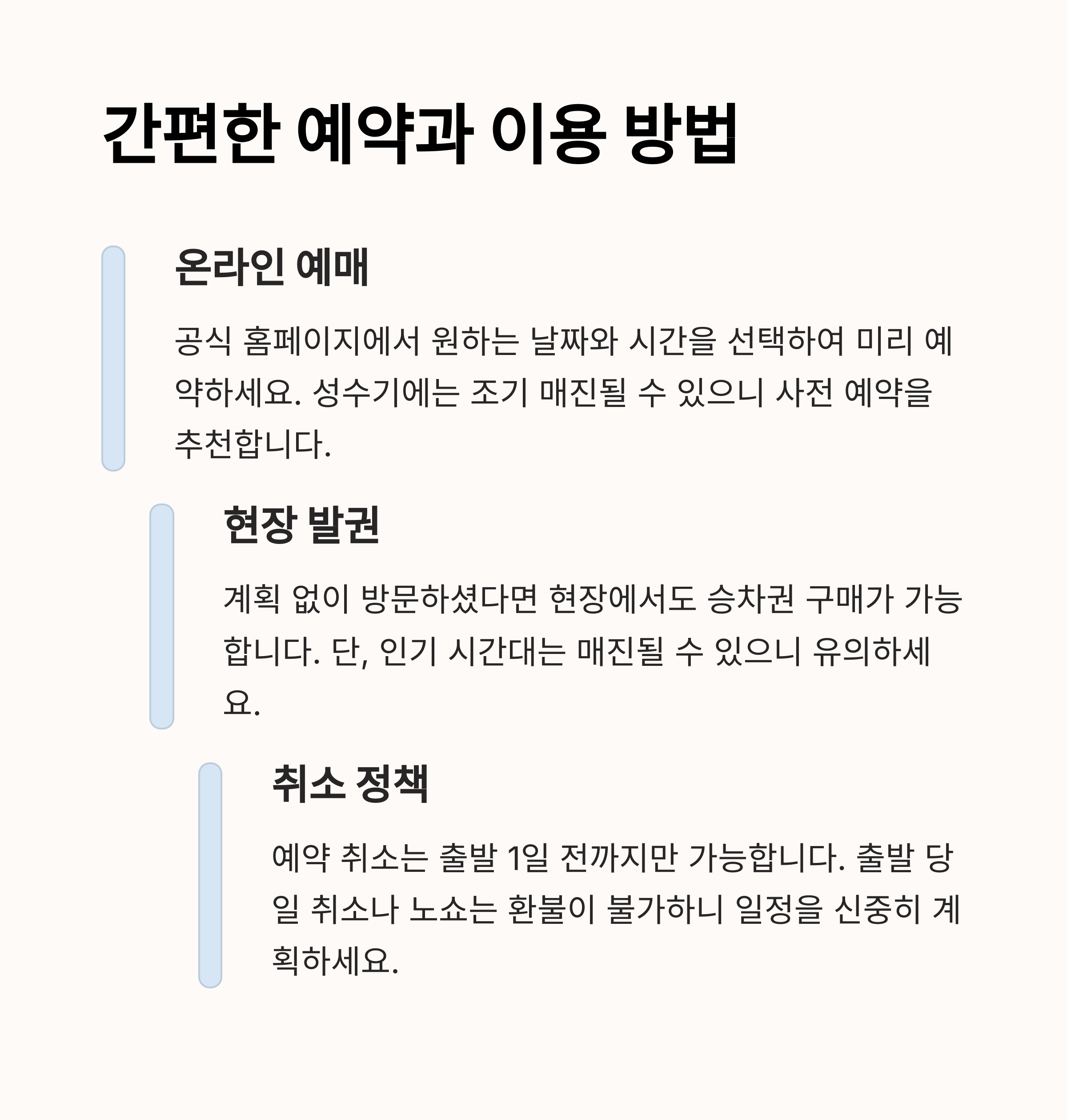 온라인 사전 예약으로 대기 시간을 단축하고, 원하는 시간대에 출발하는 것이 가장 현명한 선택입니다.