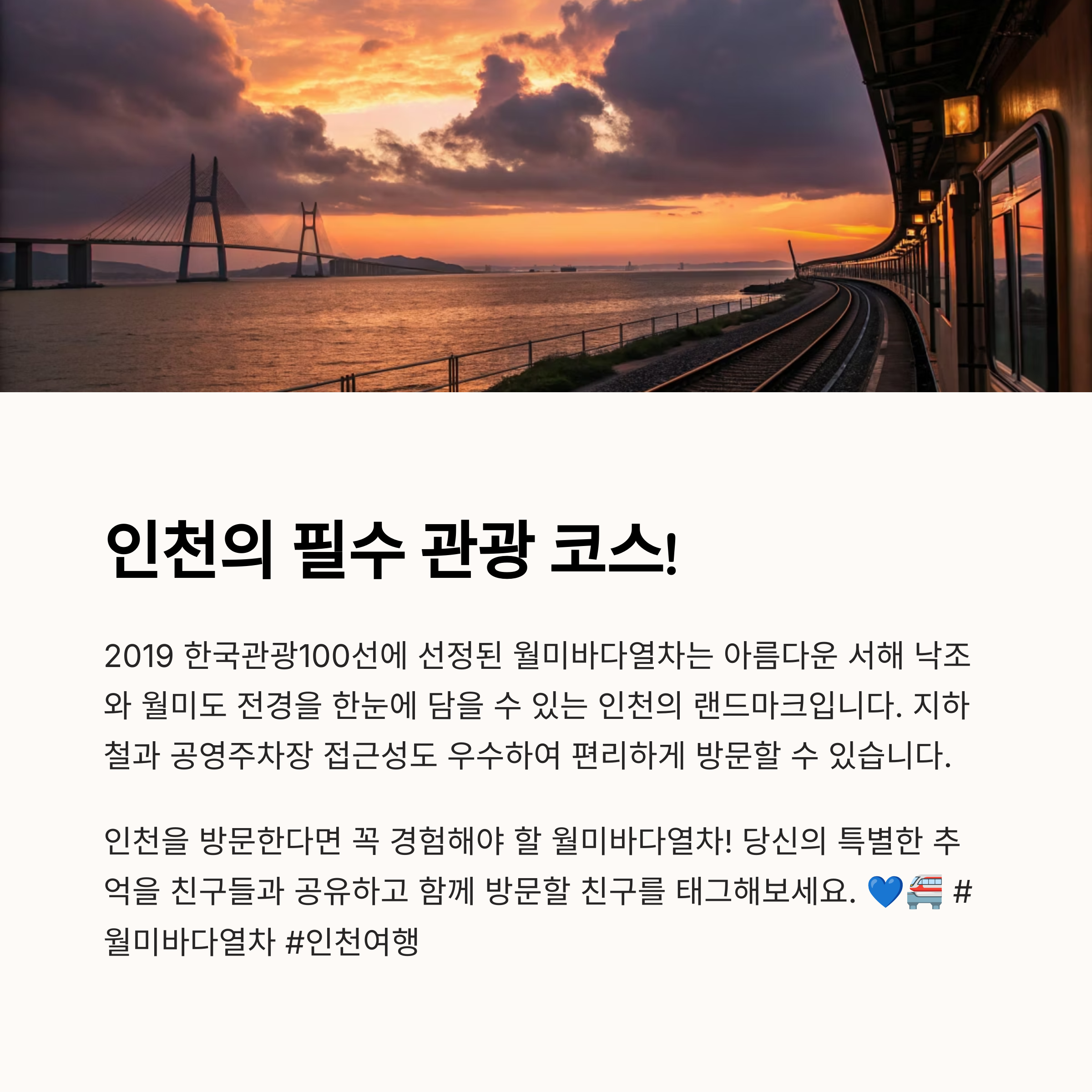 월미바다열차는 인천 여행 코스에서 절대 빼놓을 수 없는 관광 콘텐츠입니다.