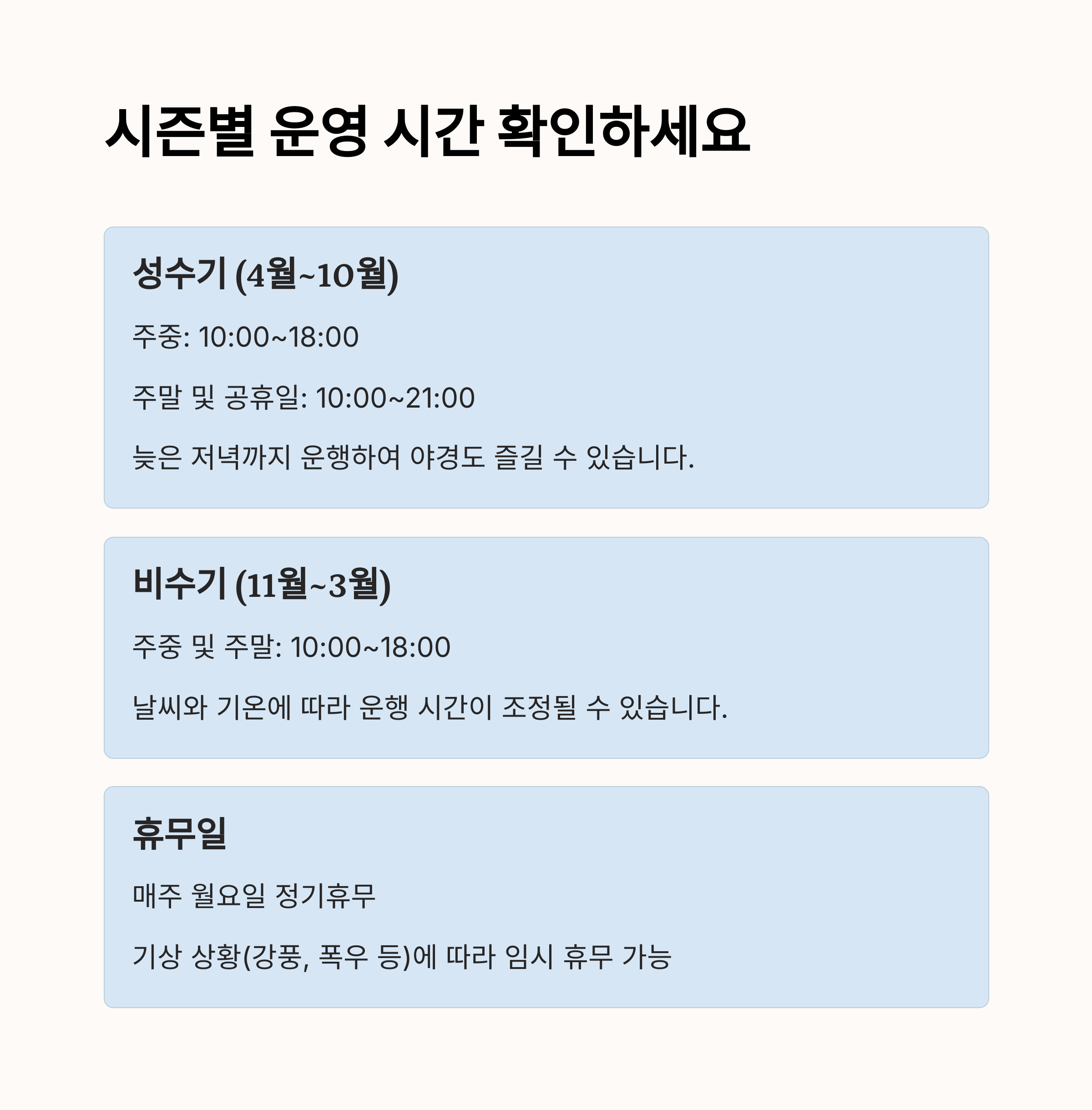 성수기에는 저녁 9시까지 운행되니, 야경 감상 기회도 놓치지 마세요.