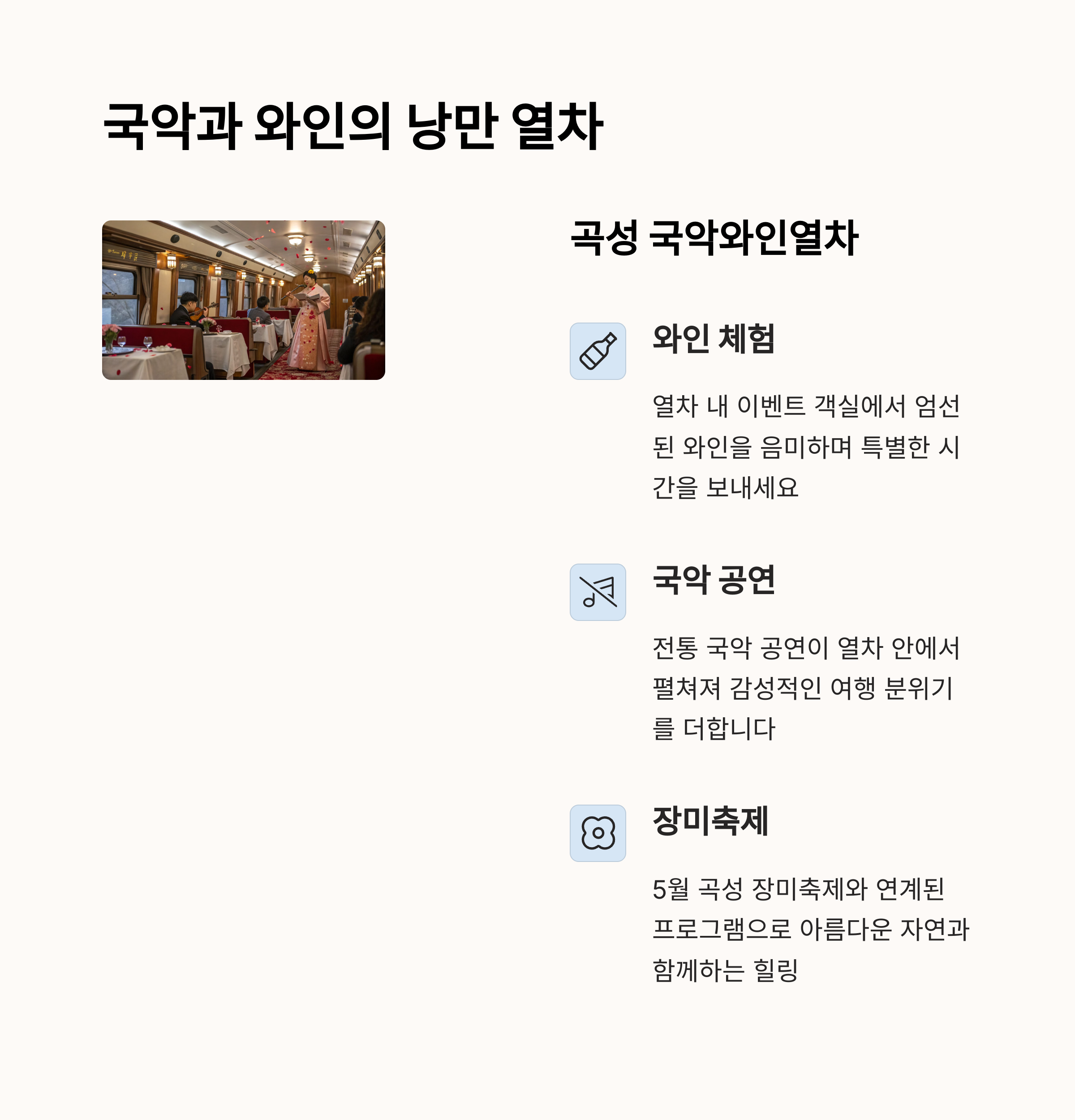 | 국악와인열차는 음악과 미식을 즐길 수 있는 특별한 열차입니다. 열차에서는 국악 공연과 와인 테이스팅이 이루어져 문화적 즐거움이 가득합니다. 일반 객실과 이벤트 객실이 나누어져 있어, 취향에 따라 선택할 수 있습니다. 정차역은 곡성과 남원을 경유하며 곡성 세계장미축제나 남원 허브밸리를 방문합니다. 제공되는 도시락과 와인은 현지 감성을 담아 특별 제작된 메뉴가 포함되어 있습니다. |