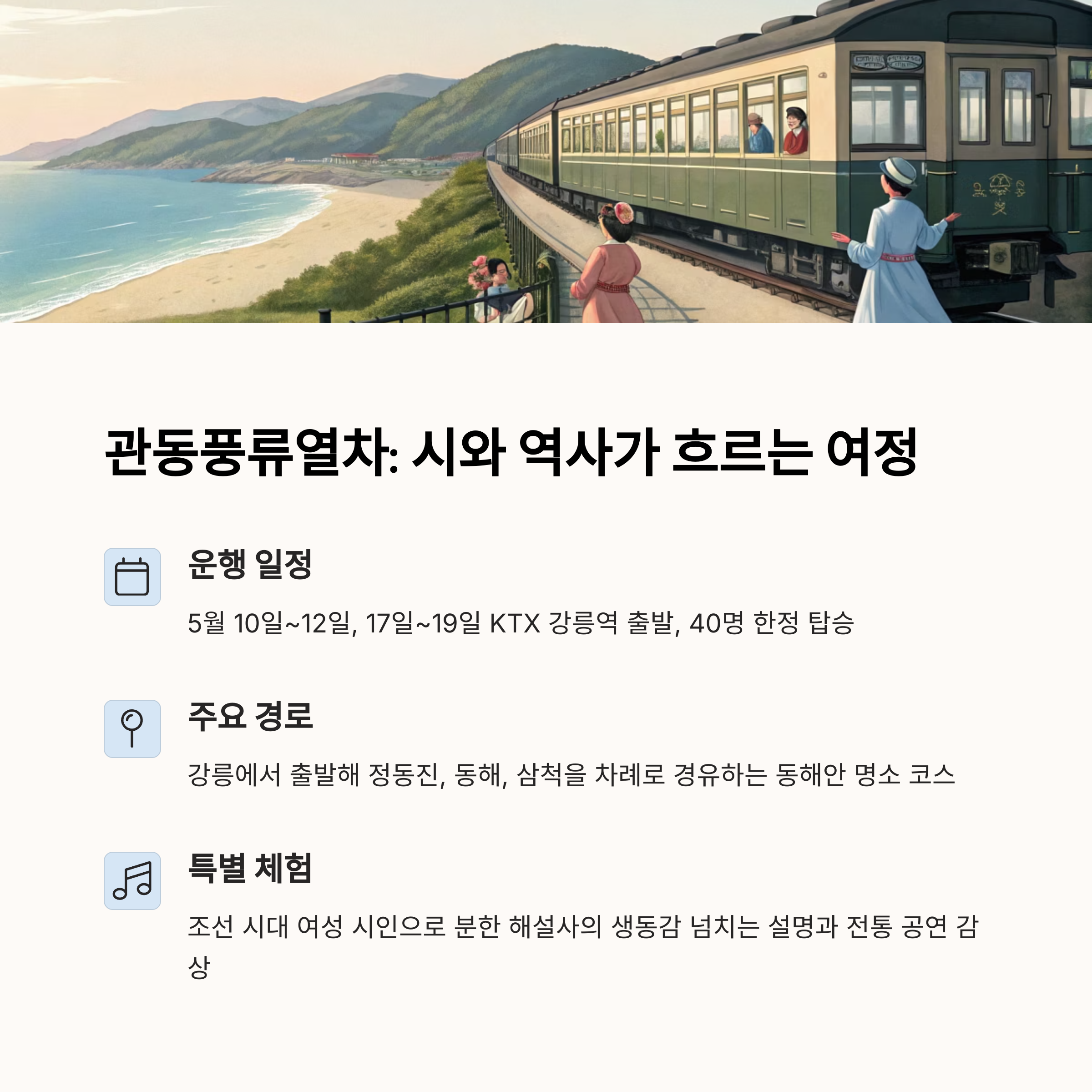 관동풍류 열차는 동해안 지역의 아름다움을 감상하며 조선 시대의 문화적 풍류를 체험하고자 하는 여행객들에게 매력적인 선택이 됩니다.