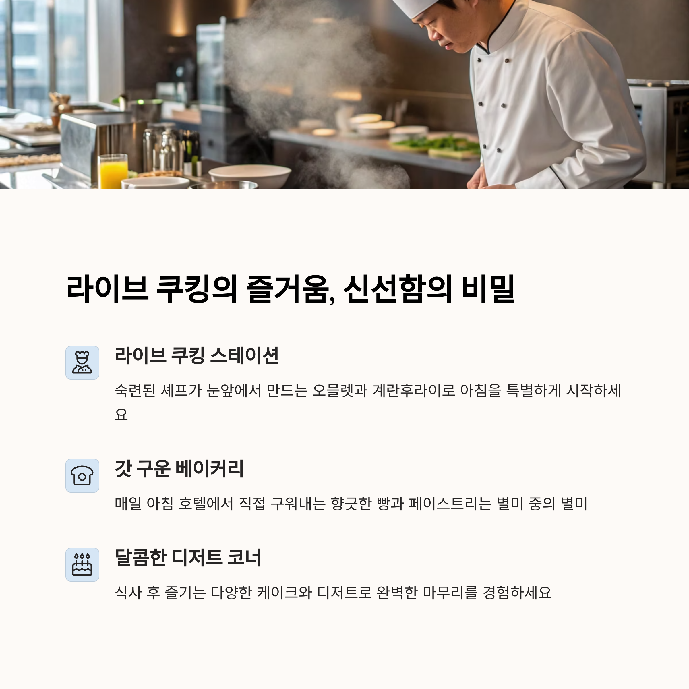 조식 라이브 스테이션에서는 즉석 요리를 추천 메뉴로 제공하여 신선함을 보장합니다.
