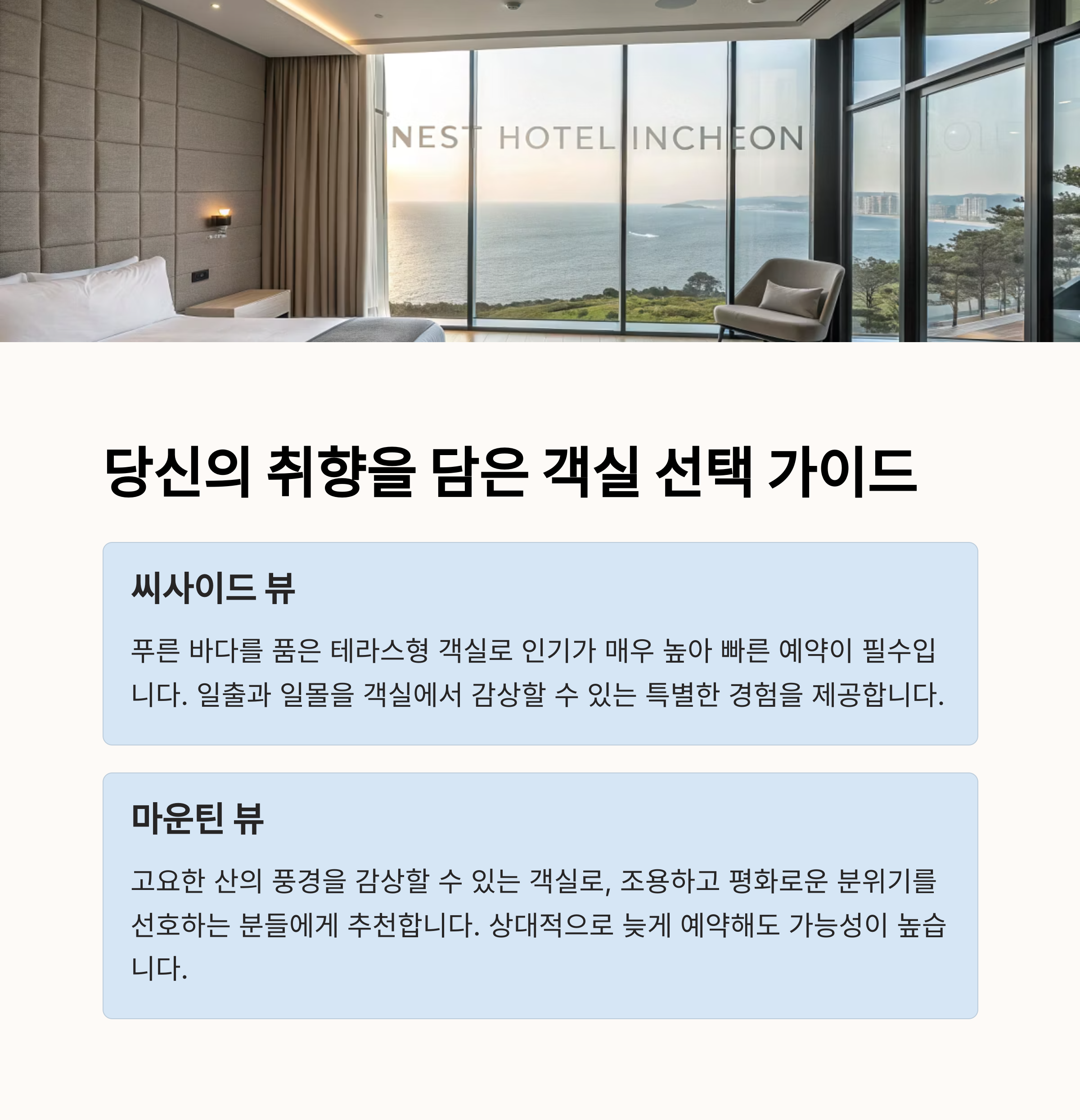 네스트호텔의 씨사이드뷰 옵션은 타 호텔보다 경쟁적인 가격에 제공되며, 조식 이용 시 추가로 바다 전경을 감상할 수 있다는 점도 매력 포인트입니다.