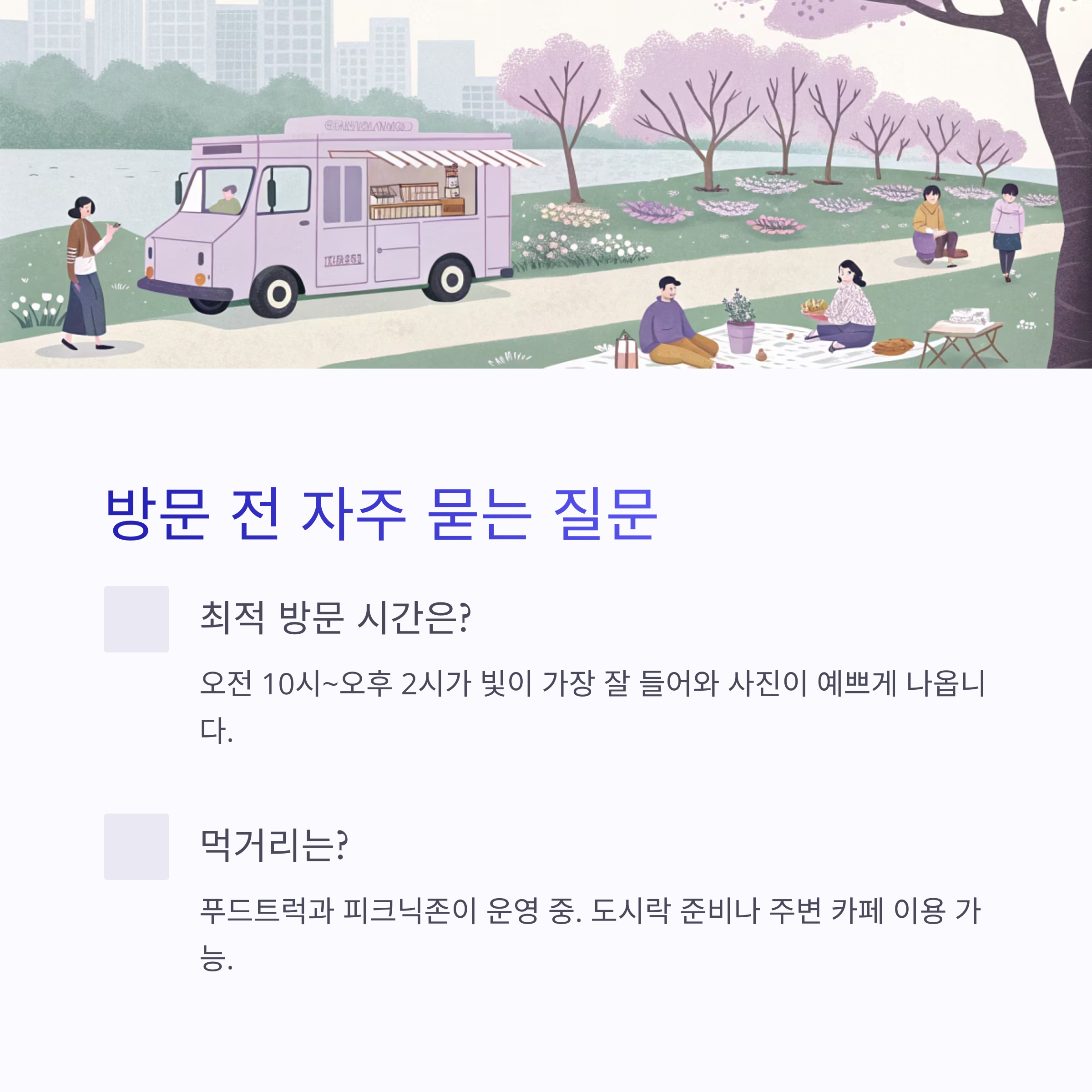 A. 네, 푸드트럭과 피크닉존이 운영 중입니다.