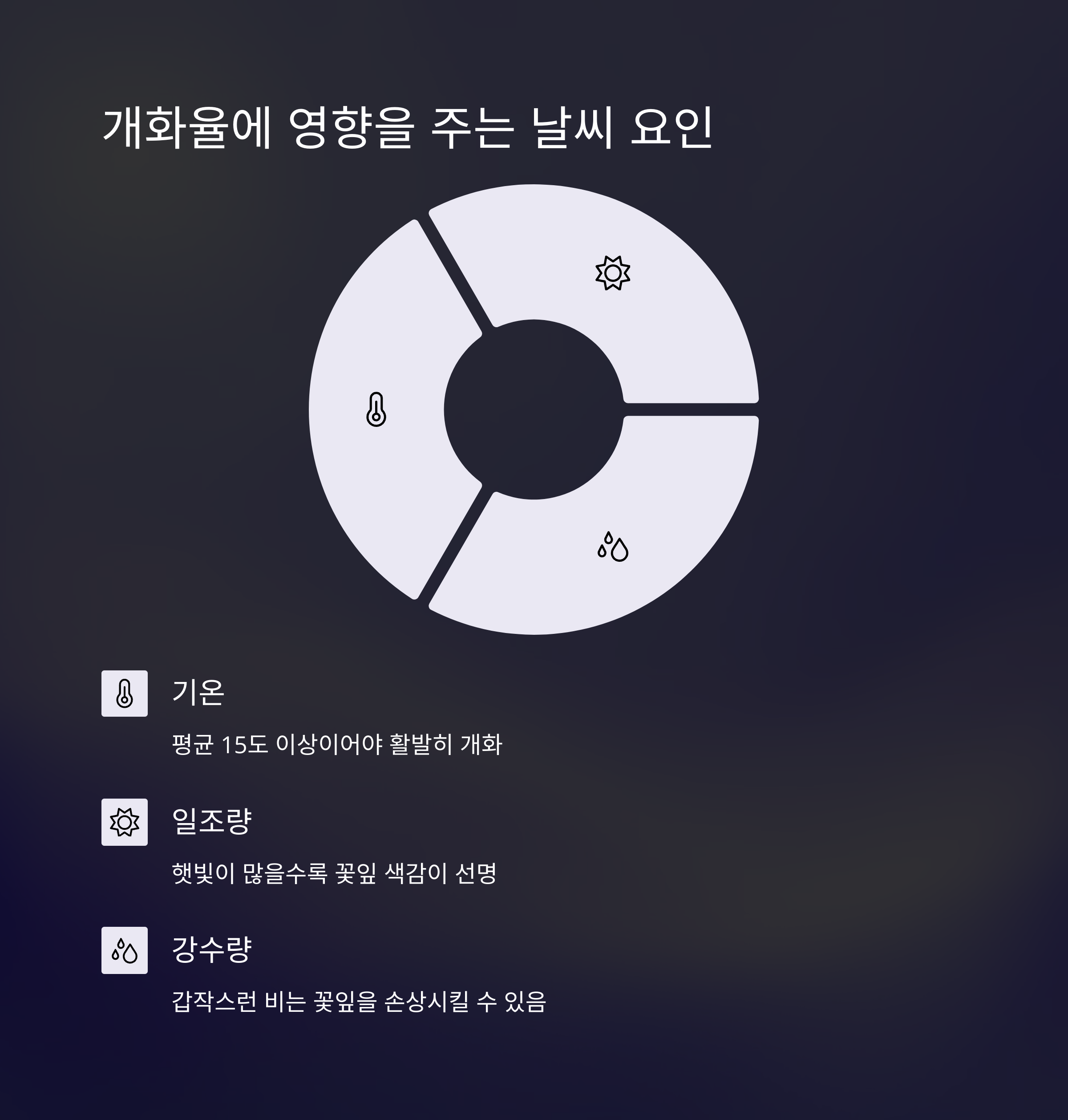 - 기온: 평균 15도 이상이어야 활발히 개화