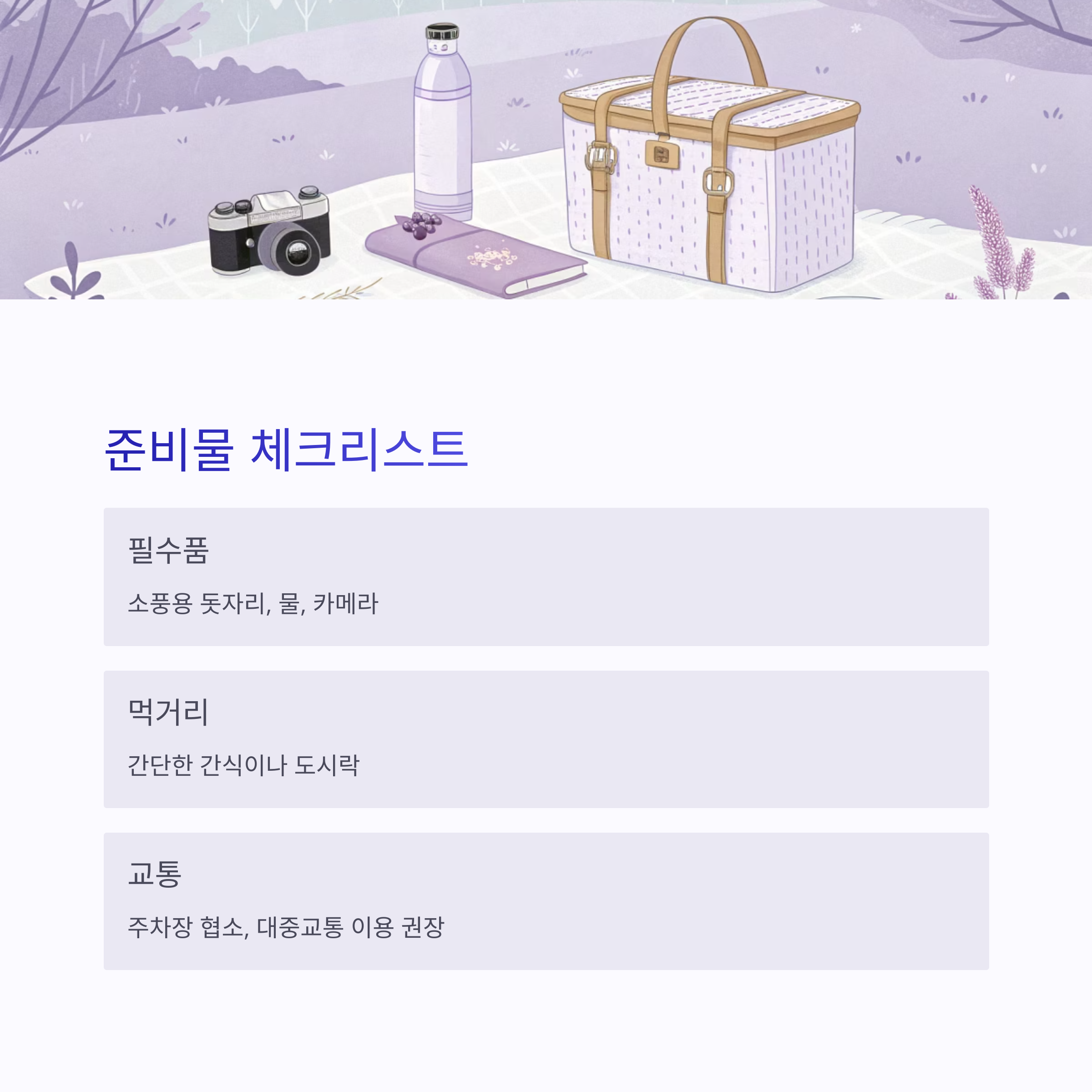 소풍용 돗자리, 간단한 간식, 물, 카메라는 필수 준비물이에요.