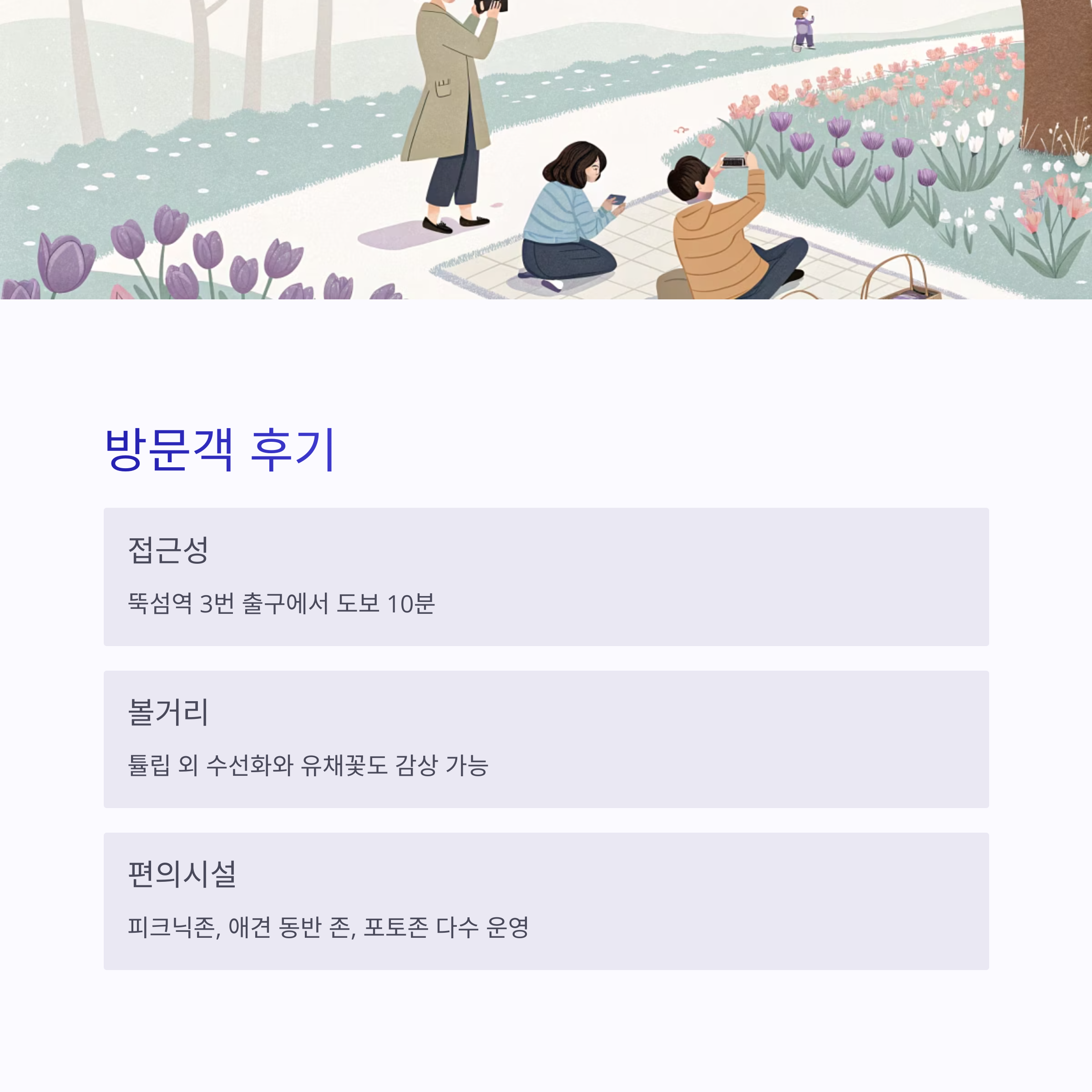 - 튤립 외에도 수선화와 유채꽃도 감상 가능