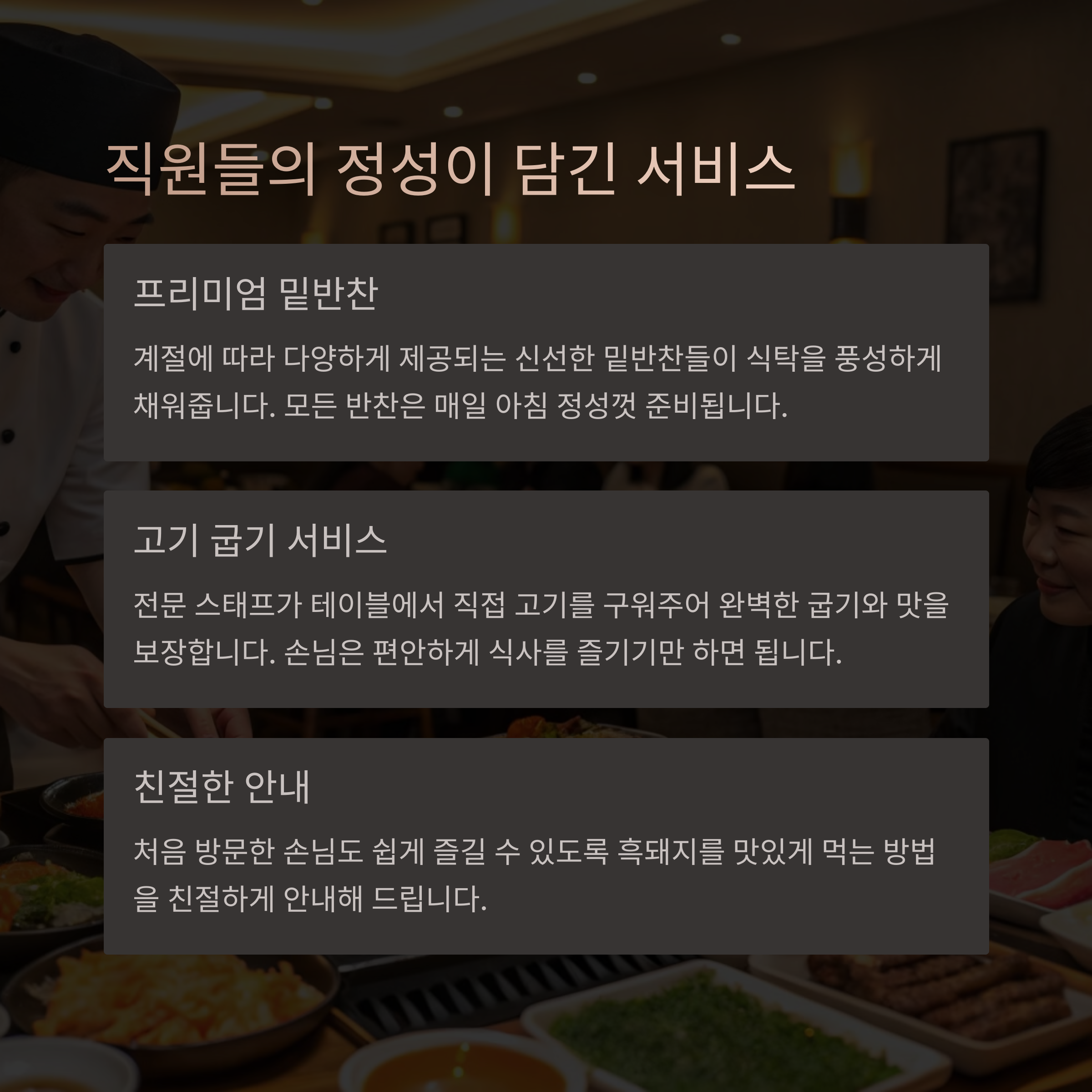 이곳의 가장 큰 특징은 멜젓과 고사리를 곁들여 먹는 제주 전통 방식입니다. 불판 위에 정성껏 구워지는 두툼한 흑돼지 오겹살은 육즙이 가득하며, 고사리와 함께 먹을 때 그 풍미가 더욱 살아납니다. 또한, 고기를 직접 구워주는 직원들의 친절한 서비스 덕분에 처음 방문하는 여행자들도 불편함 없이 식사를 즐길 수 있습니다. 고기뿐 아니라 곁들여 나오는 밑반찬들도 매우 정갈하고 맛이 좋아 전체적인 식사의 완성도를 높여줍니다.