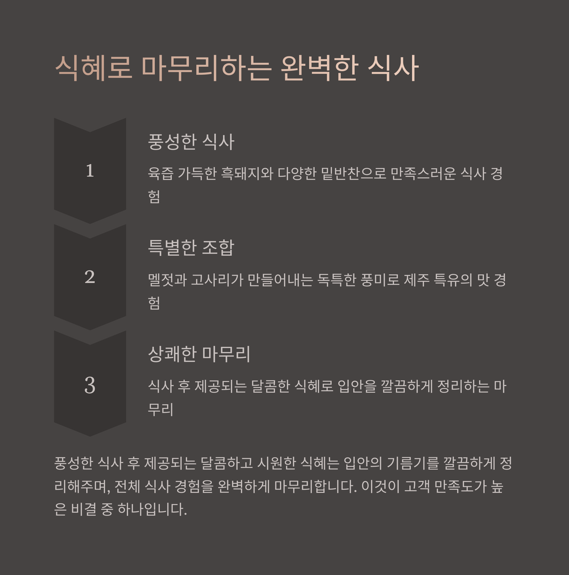 마지막으로 식사를 마무리할 때 제공되는 식혜는 입안을 깔끔하게 정리해주며 만족도를 더해줍니다. 식사를 마친 뒤 세화해수욕장에서 여유롭게 산책을 즐기며 제주의 정취를 느껴보는 것도 추천합니다. 풍성한 맛, 친절한 서비스, 아름다운 풍경까지 모두 즐길 수 있는 세화그때그집은 진정한 제주 여행의 필수 코스라 할 수 있습니다.
